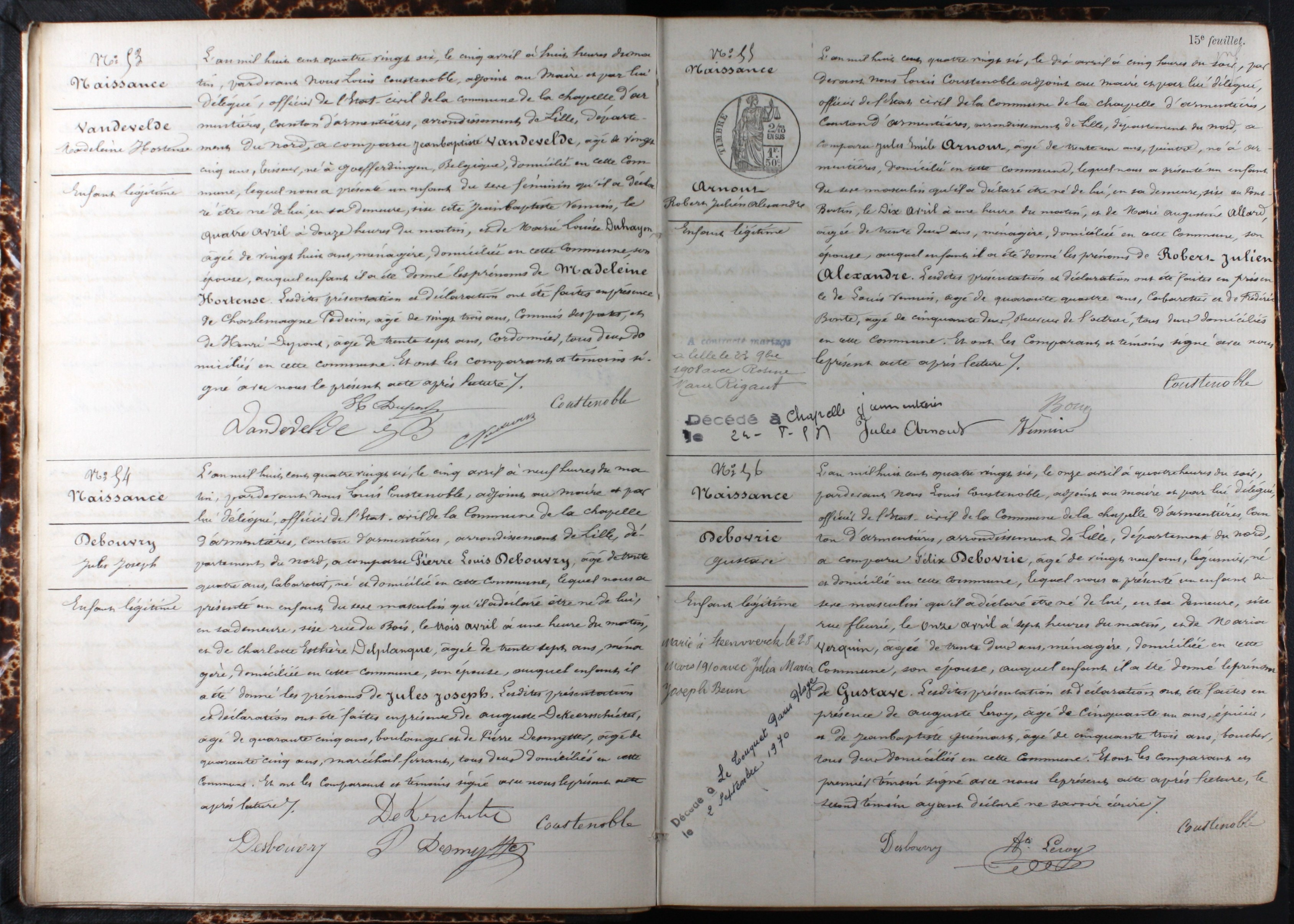 Il manque entre les vues 185 et 186, la vue relative aux naissances des actes 53 à 56 de l'année 1886. Je recherche l'acte 54 DEBOUVRY Jules Joseph, né le 03 avril 1885.