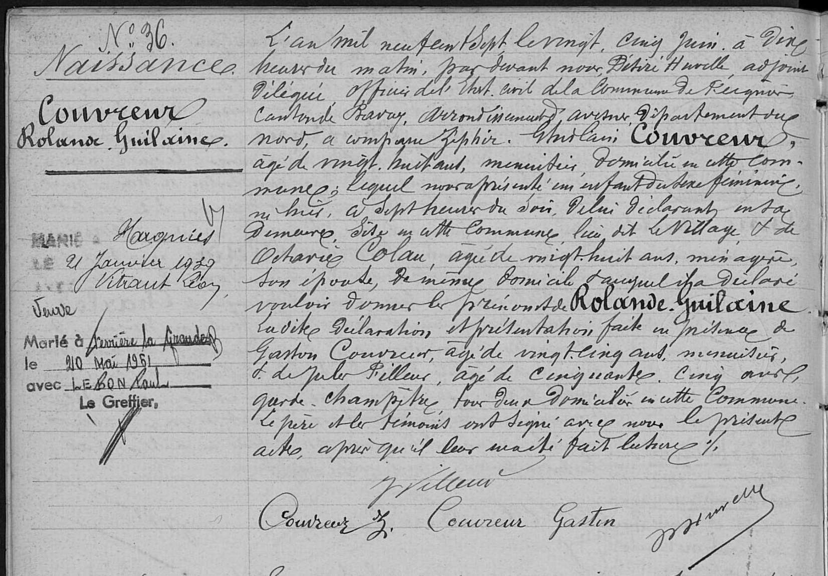 - Acte de naissance de Rolande Couvreur, née le 24/06/1907 à Feignies