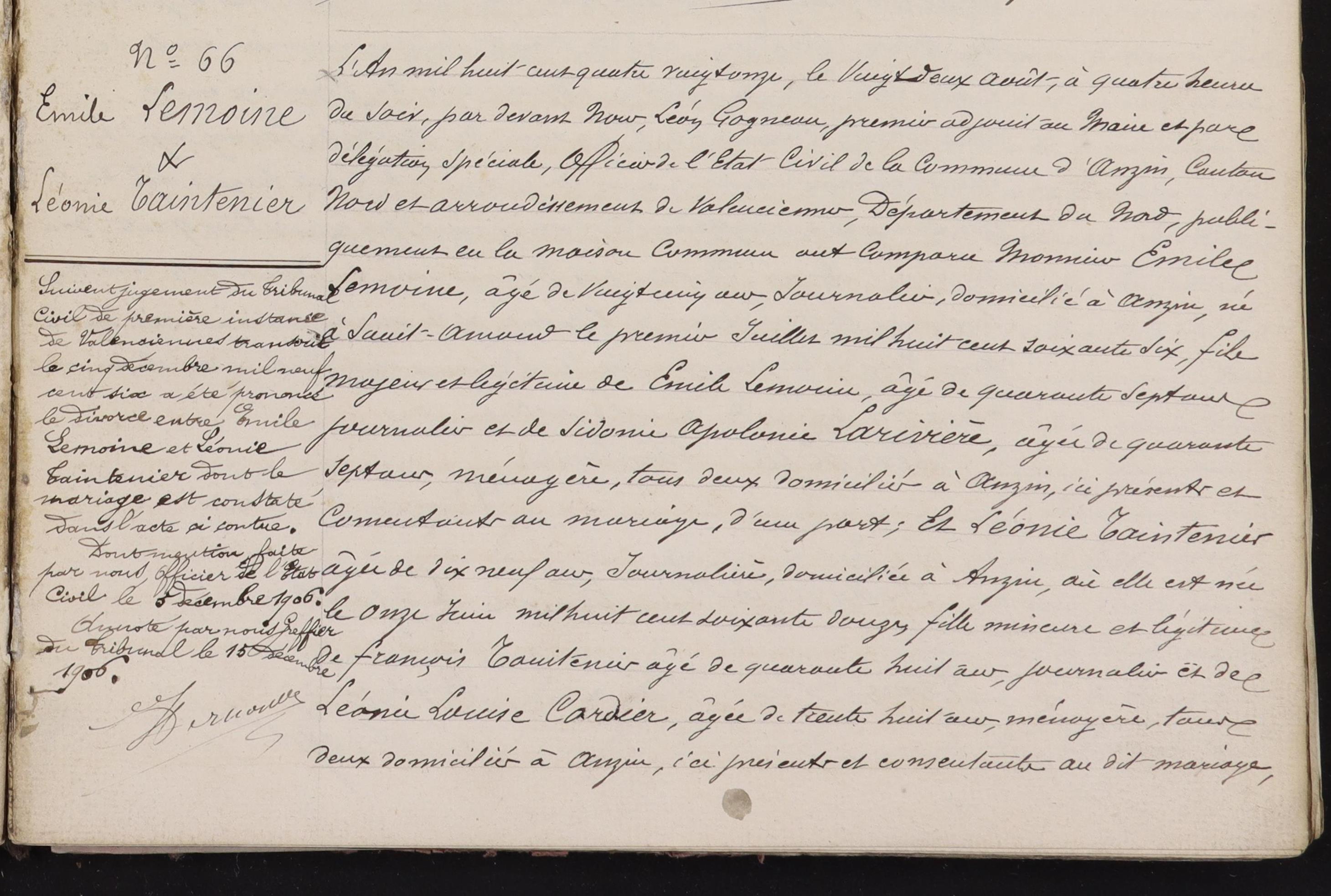 Dans le registre des mariages à ANZIN en 1891, document "Anzin/M 1890-1892- 3ESUP 1521", la vue 47 va jusqu'à l'acte n°18 et sur la vue suivante 48, on passe directement à l'acte n°77. Or je cherche l'acte n°66 du mariage le 22 Aout 1891 entre Elile LEMOINE et Léonie TAINTENIER.