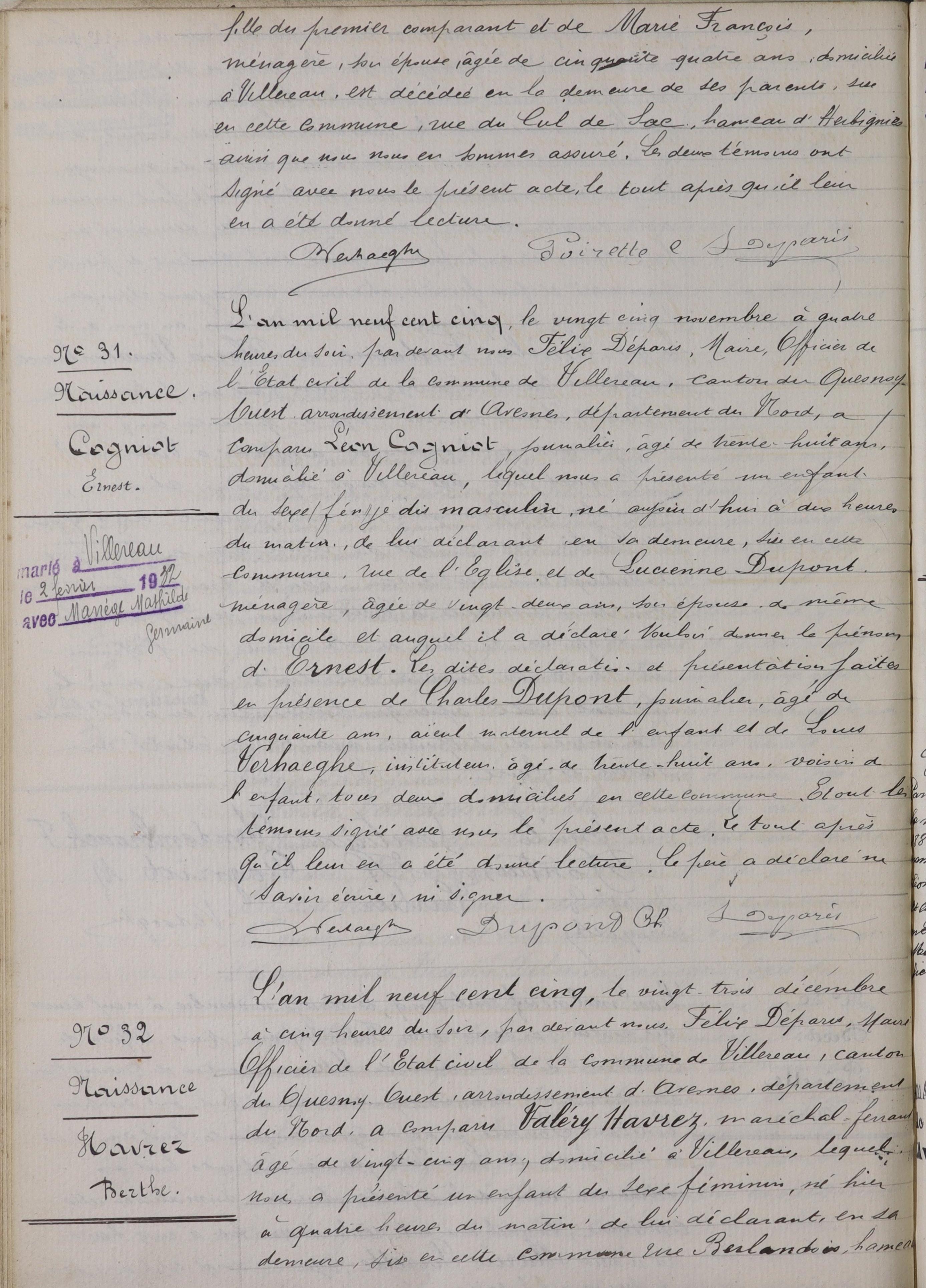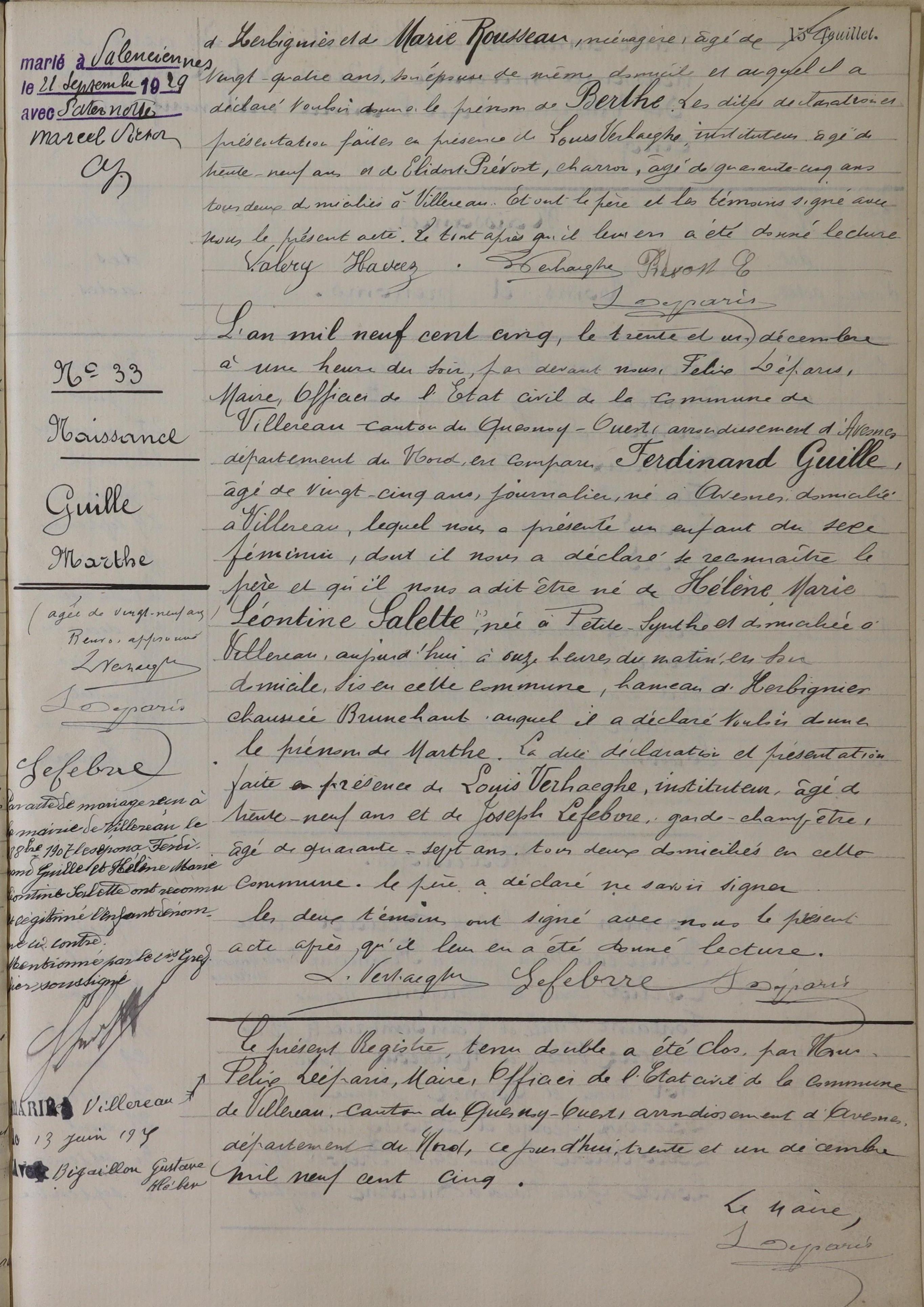 Bonjour, dans la table des NMD Villereau 1903-1905 3E11721 p.43/43 : naissance GUILLE Marthe 31/12/1905, les actes de ce relevé s'arrêtent au 12/11/1905. Pourriez-vous m'aider à retrouver cet acte ? Merci d'avance.