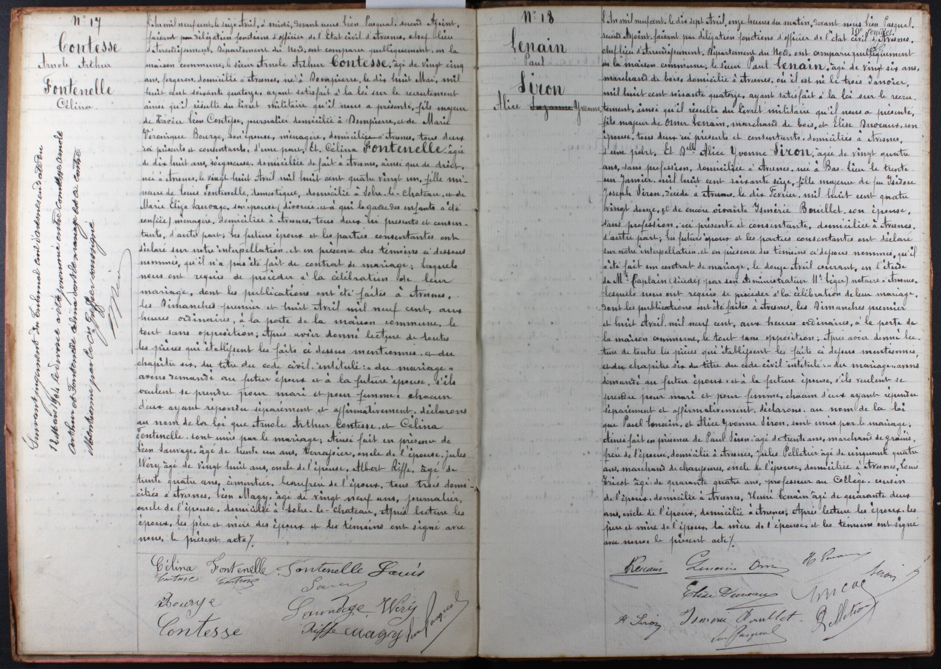 Sur la commune d'AVESNES SUR HELPE année 1900 dans les actes de mariages (3 E 7385) l'acte n°17 et n°18 sont manquantes moi je chercher l'acte n°17 mariage entre CONTESSE Arnole Arthr et FONTENELLE Célina.