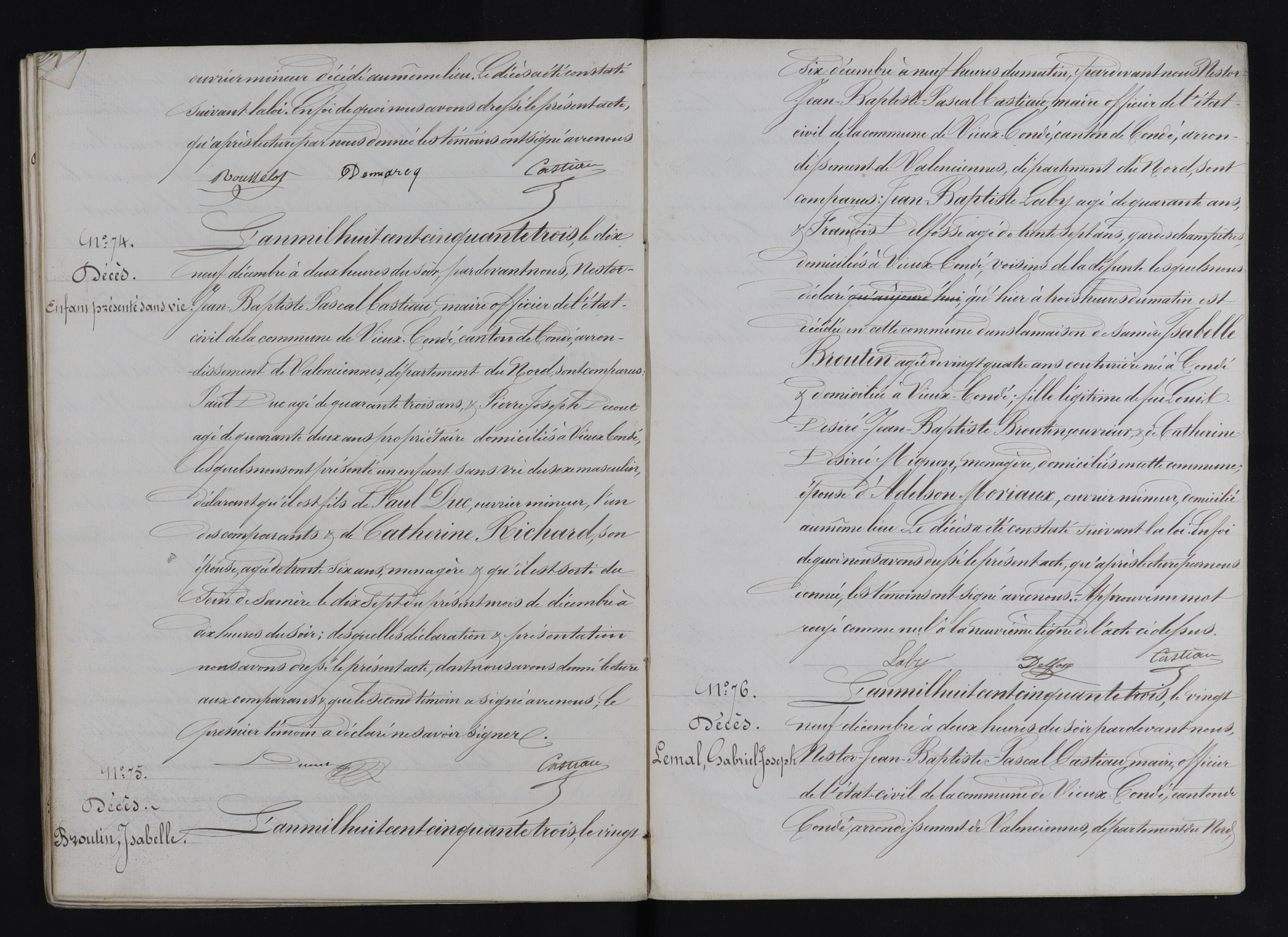 L’an 1853 le 31 décembre à 6 h du soir Nous Maire de la commune de Vieux Condé, avons clos, arrêté le présent registre de décès contenant 76 aces