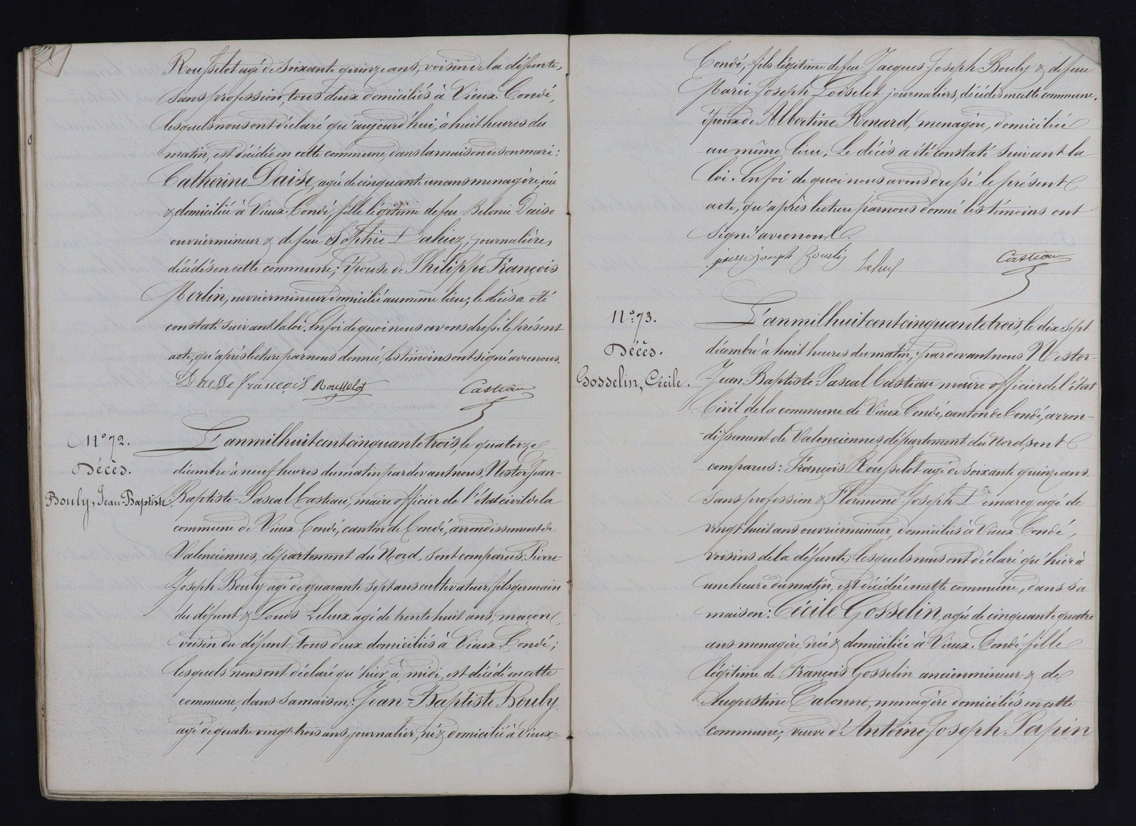 L’an 1853 le 30 novembre commune de Vieux Condé sont comparus Pierre François DAISE, 54 ans, frère germain de la défunte, ouvrier mineur, François .. ??? ... pas la fin de l'acte