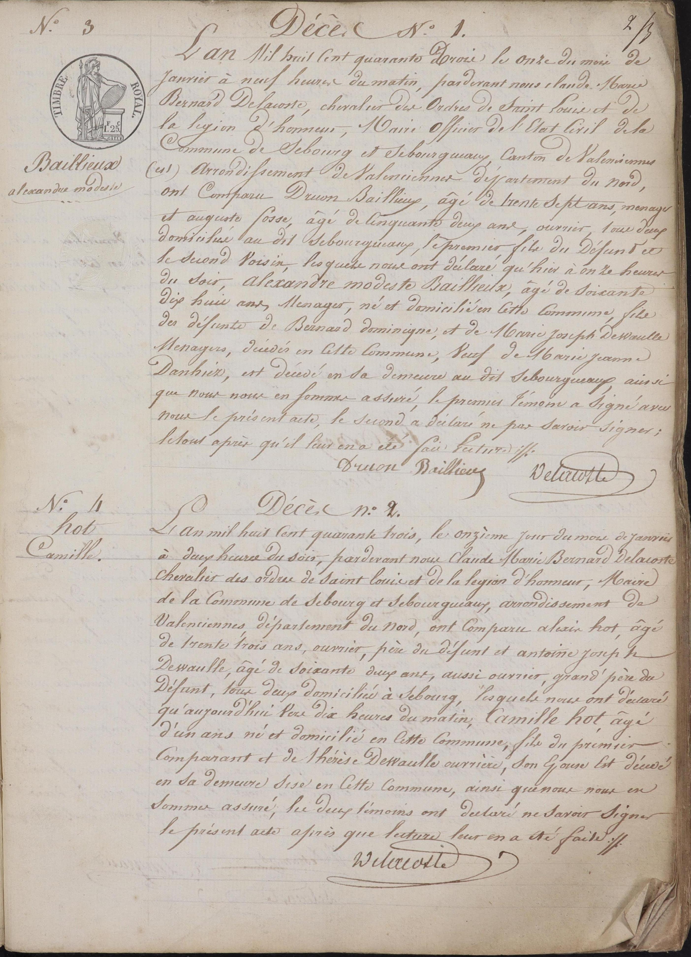 Il manque l'acte 1 du 18 04 1843 Décès de BAILLEUX Alexandre Modeste
