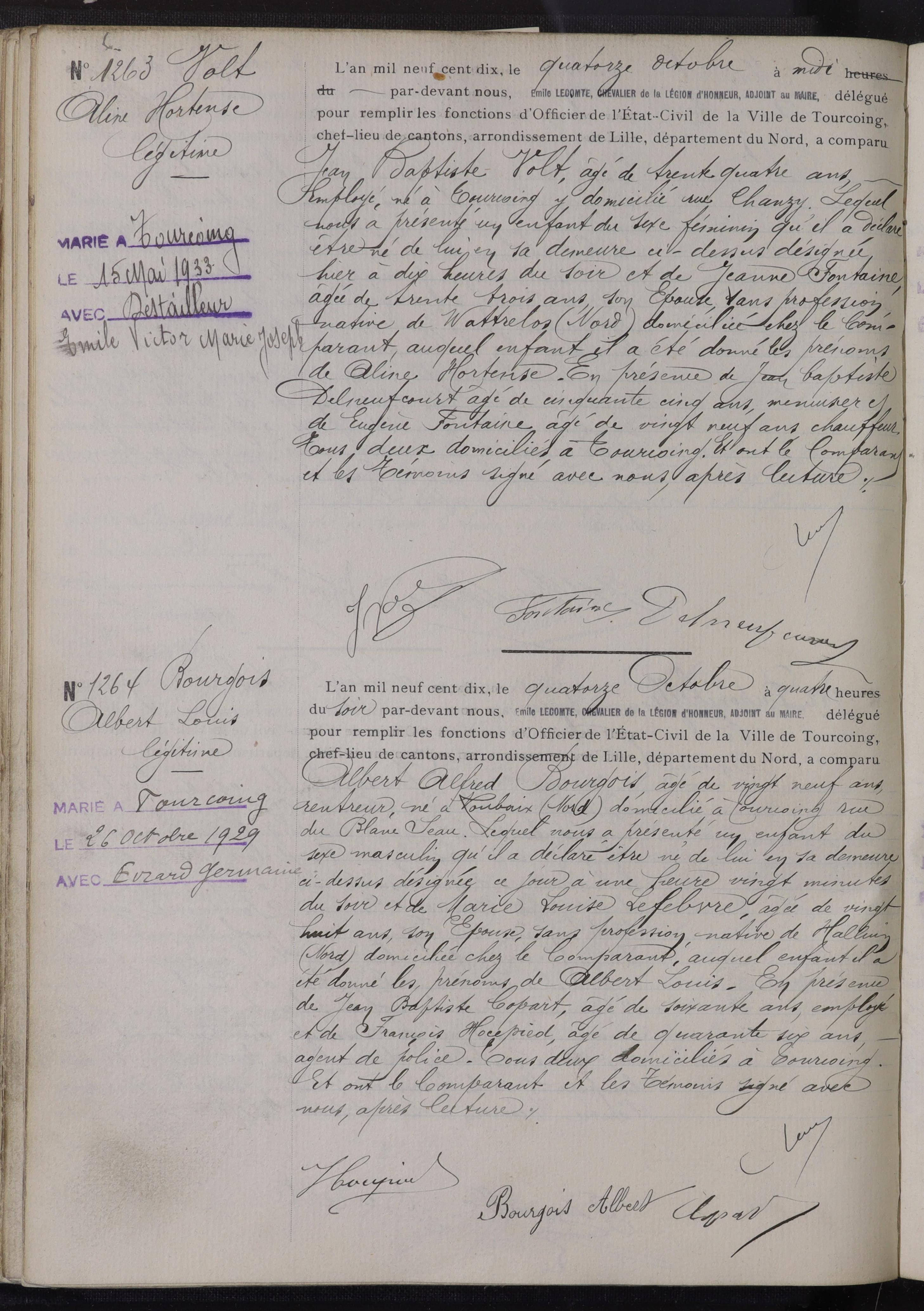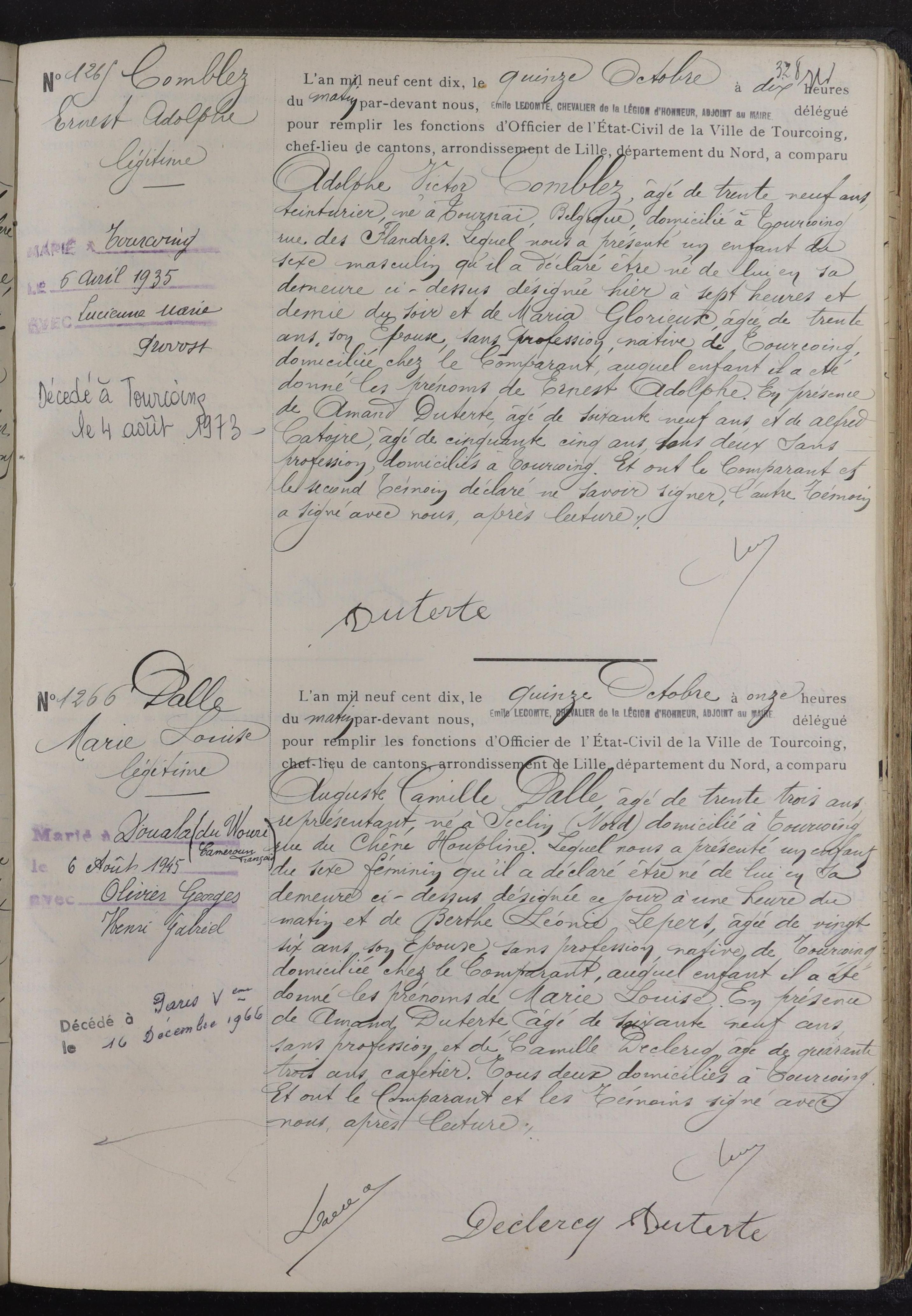 je cherche un acte de naissance en 1910 qui est dans les tables annuelles sous le numéro 1266 DALLE Marie Louise le 15 octobre 1910, manquent aussi les actes 1263,1264 et 1265