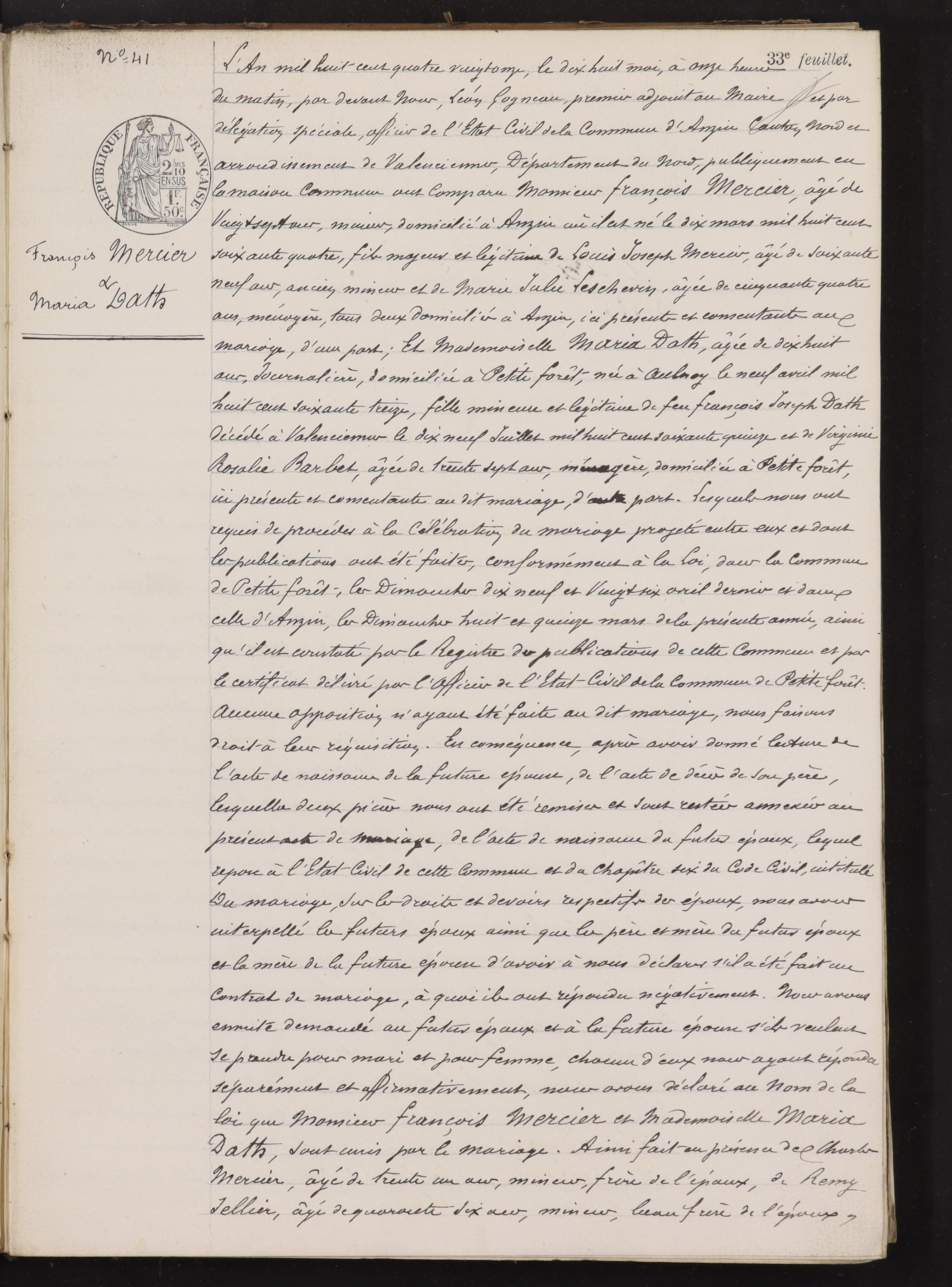 Je vous remercie beaucoup de m'avoir fait parvenir l'acte de mariage de Mercier François et Dath Maria.