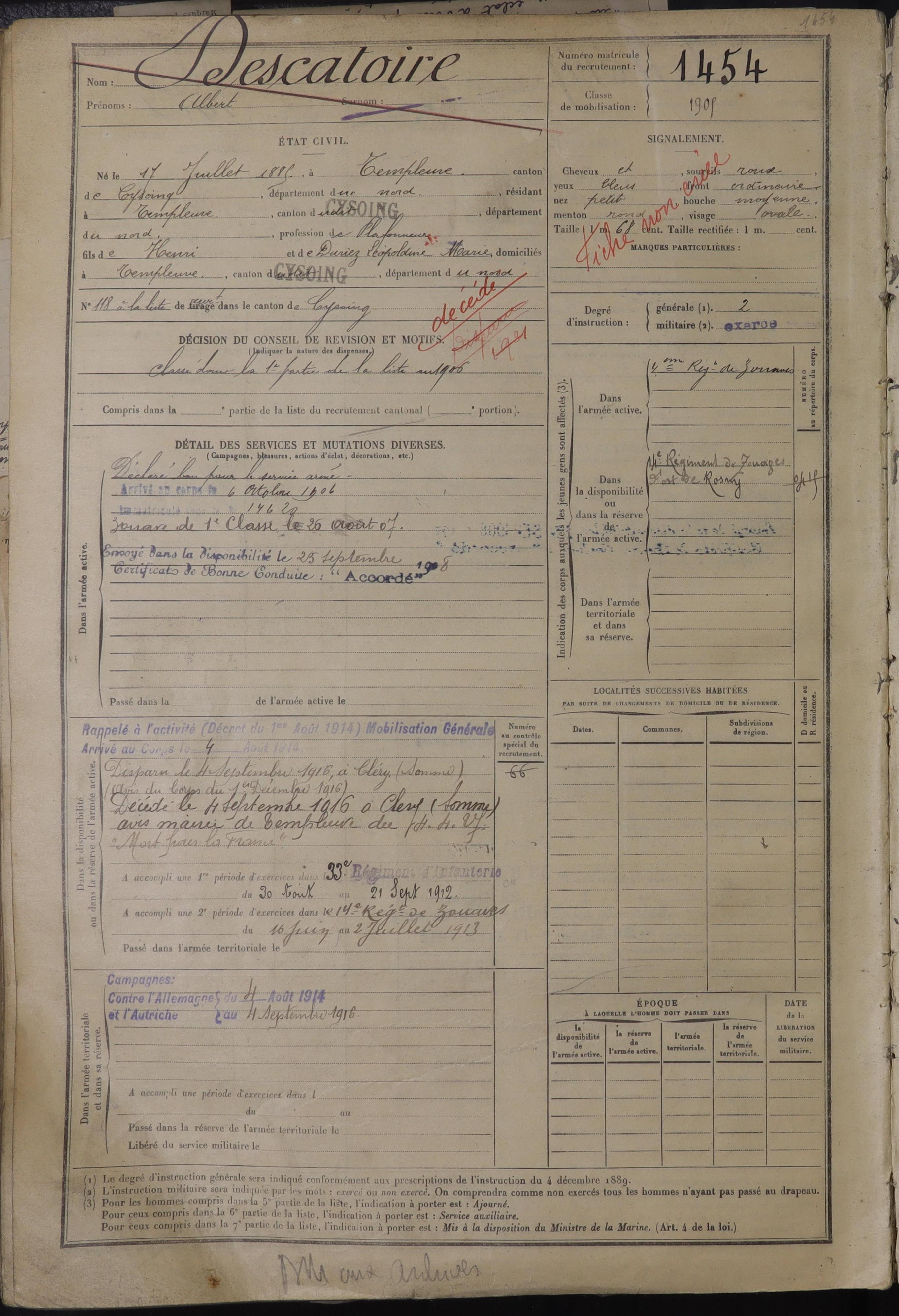 Je recherche la fiche matricule N°1454 du bureau de Lille classe 1905 au nom de DESCATOIRE Albert