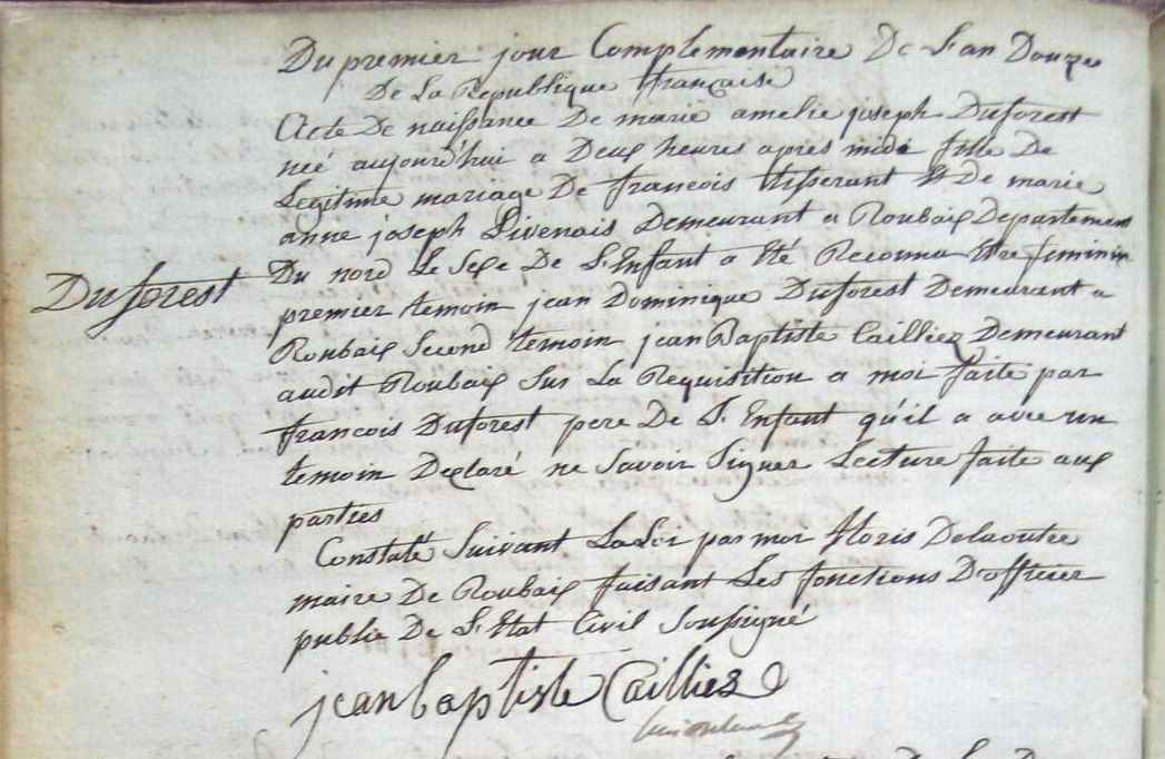 Dans les Tables Décennales 1804 il est indiqué la naissance de Marie Amélie Joseph DUFOREST le 1er jour complémentaire de l'An XII : or, il n'y a pas