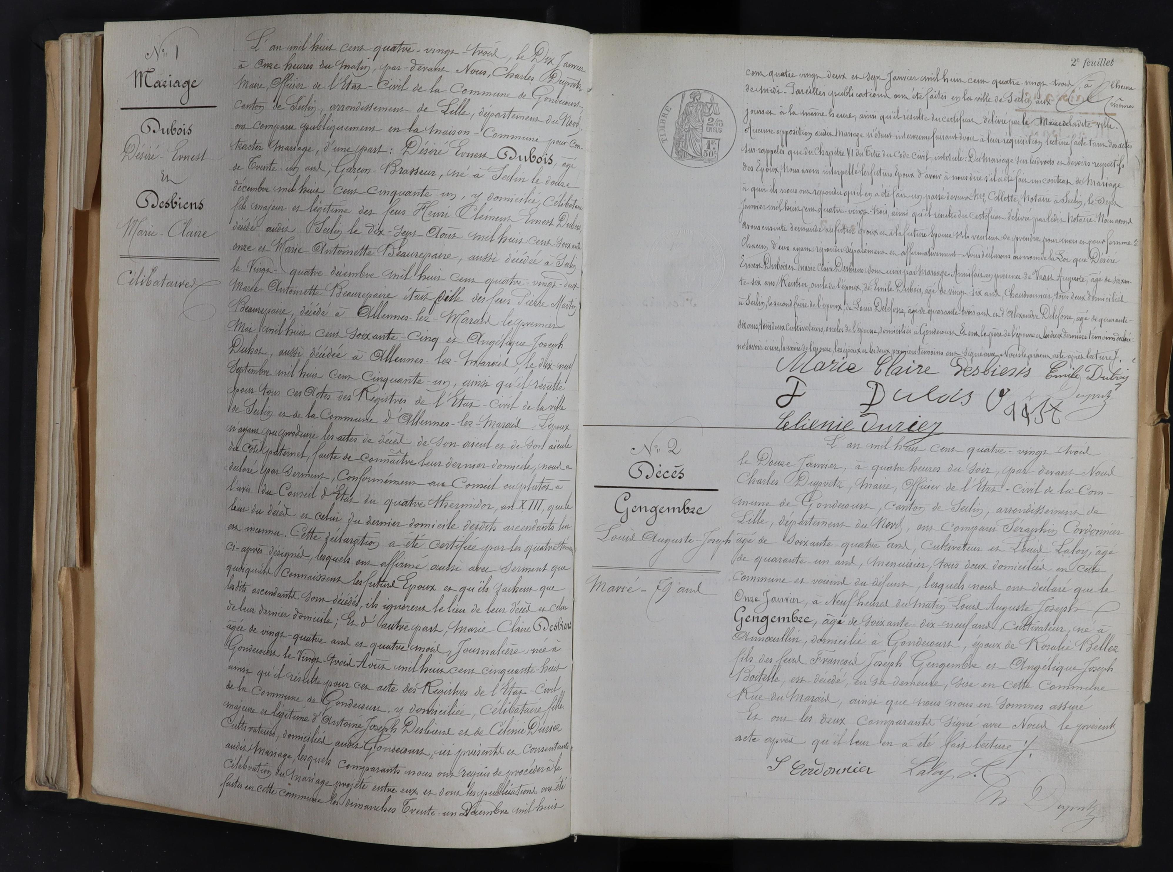 Dans le cadre de recherches généalogiques, je viens de m'apercevoir que dans le fichier numérisé en ligne des archives de l'état civil de Gondecourt pour l'année 1883 il maque les pages contenant les actes n° 1 et 2 . Pourriez vous n'envoyer une copie informatique en pdf ou jpeg de l'acte n° 1 concernant le mariage de Dubois Désiré Ernest avec Desbiens Marie-Claire le 10 /01/1883.
