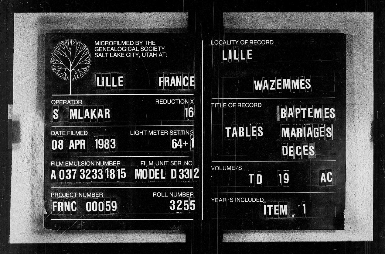 La table décennale B-M-D LILLE (WAZEMMES) / T [1604-1834] datant du 6 juin 1940 répertorie l'ensemble des actes sur la commune de Wazemmes.