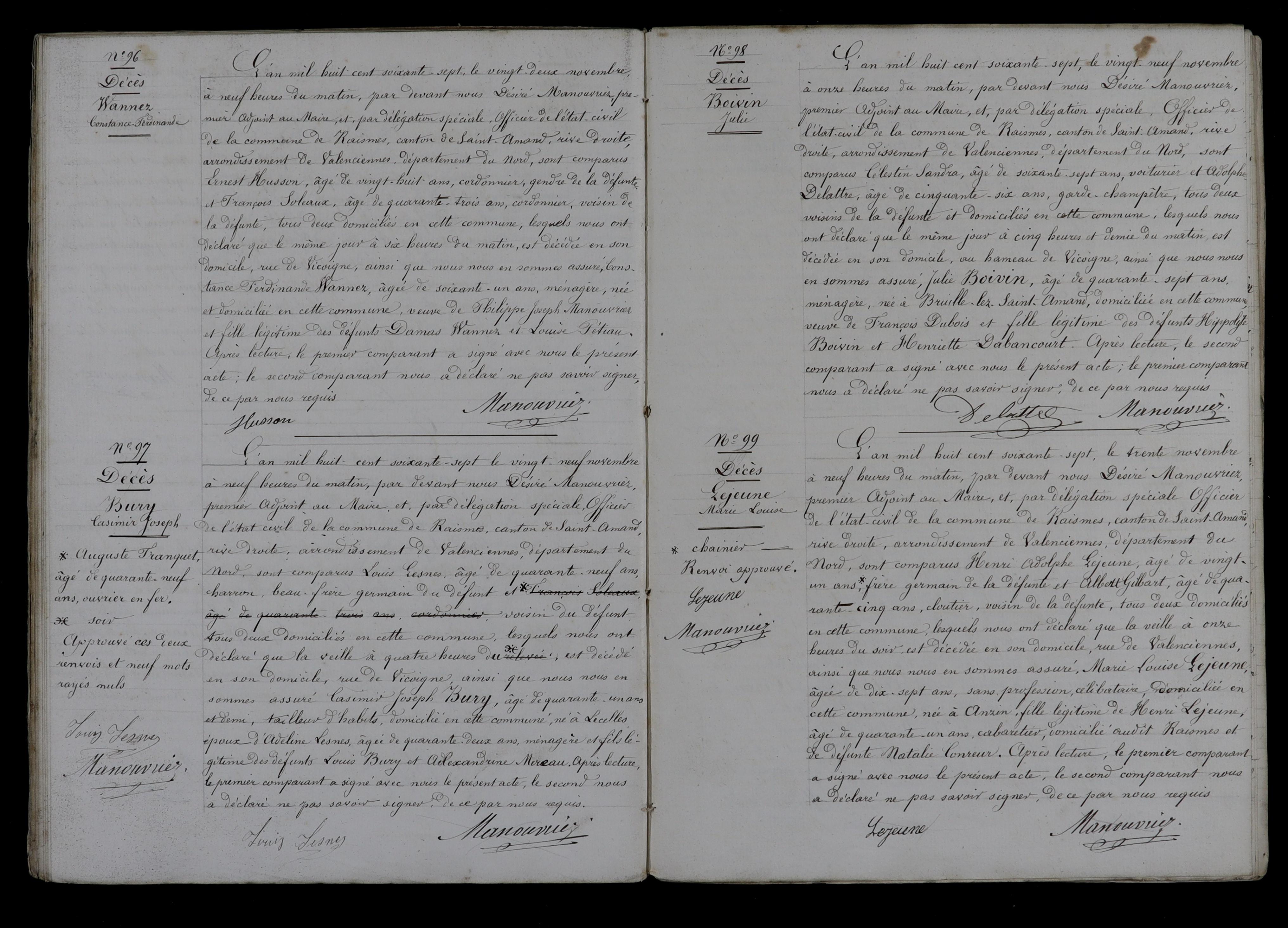 Je suis en train de réaliser mon arbre généalogique et je suis à la recherche de mon ancêtre, Julie Boivin, décédée en 1867 à Raismes. L'acte daterait du 29 novembre 1867 mais il est manquant dans le registre scanné RAISMES / MD [1867-1867]5 Mi 053 R 025. Il manque les actes 96 à 99. Serait-il éventuellement possible de me faire parvenir l'acte 98 de Julie Boivin.