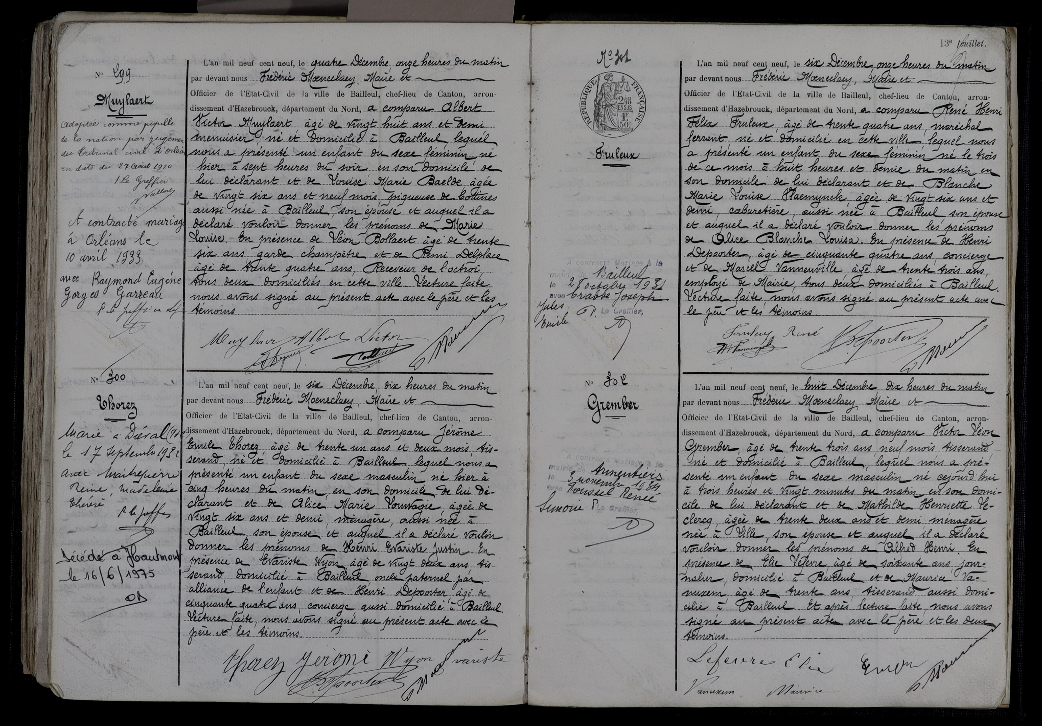 J'ai constaté, que les "Registres paroissiaux et d'état civil" de la ville de BAILLEUL 1908/1909, et plus précisément pour l'année 1909, l'absence du feuillet 13 (est-il absent du registre ou n'a-t-il pas été numérisé ?). Je serai intéressé par l'acte N°300 de ce feuillet, concernant l'acte de naissance de Henri Evariste Justin Thorez.