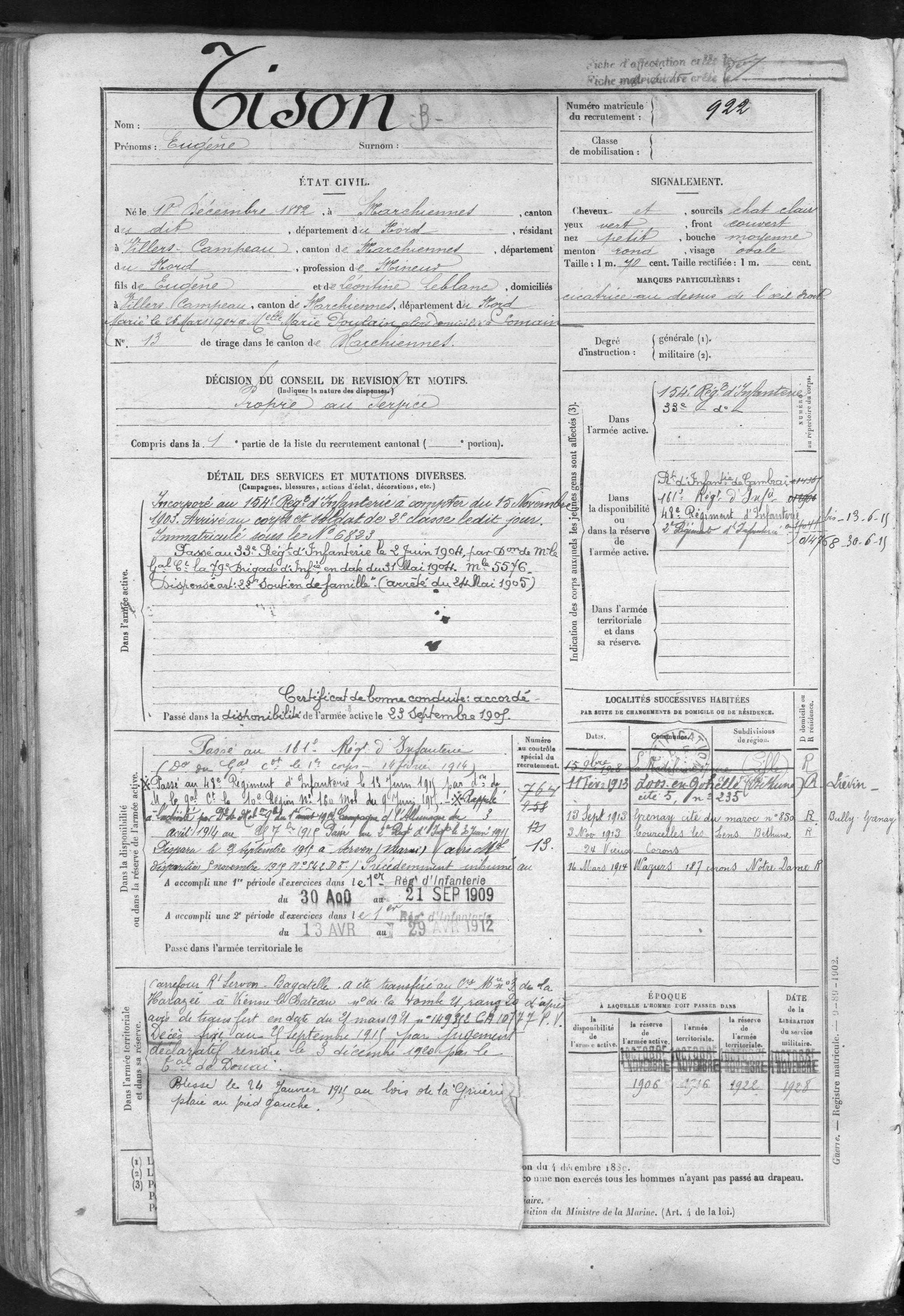 je vous joins la fiche matricule pour TISON Eugène, 2è classe du 2è RI, classe 1902, bureau de recrutement CAMBRAI, matricule 922 par message privé.