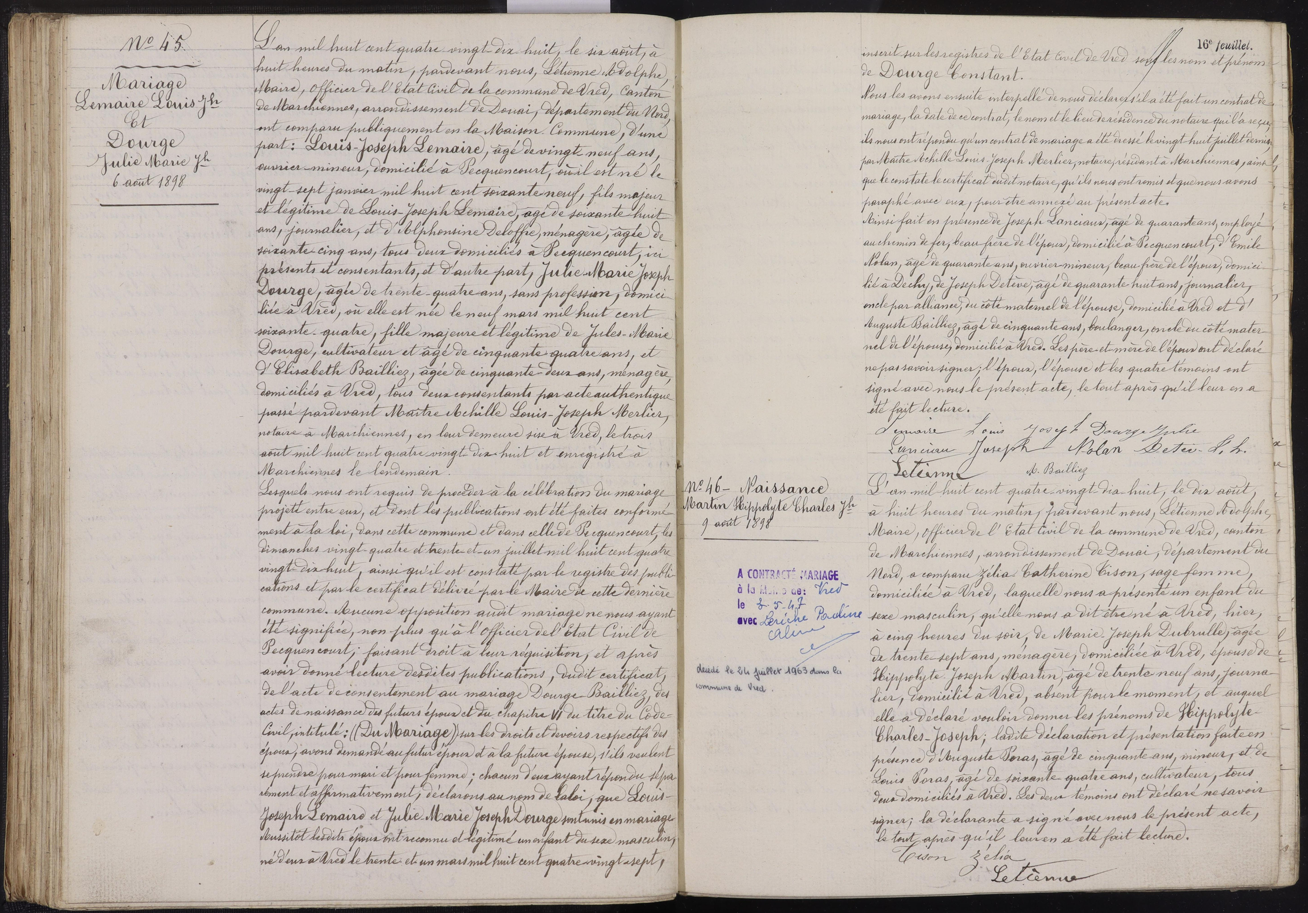 Consultant les registres de la commune de Vred (VRED / NMD [1896 - 1908]3 E 6309), je constate qu'entre les pages 73 et 74 du scan, il manque des actes. En effet, la page 73 se termine par l'acte n°44 et la page 74 commence par l'acte n°47.