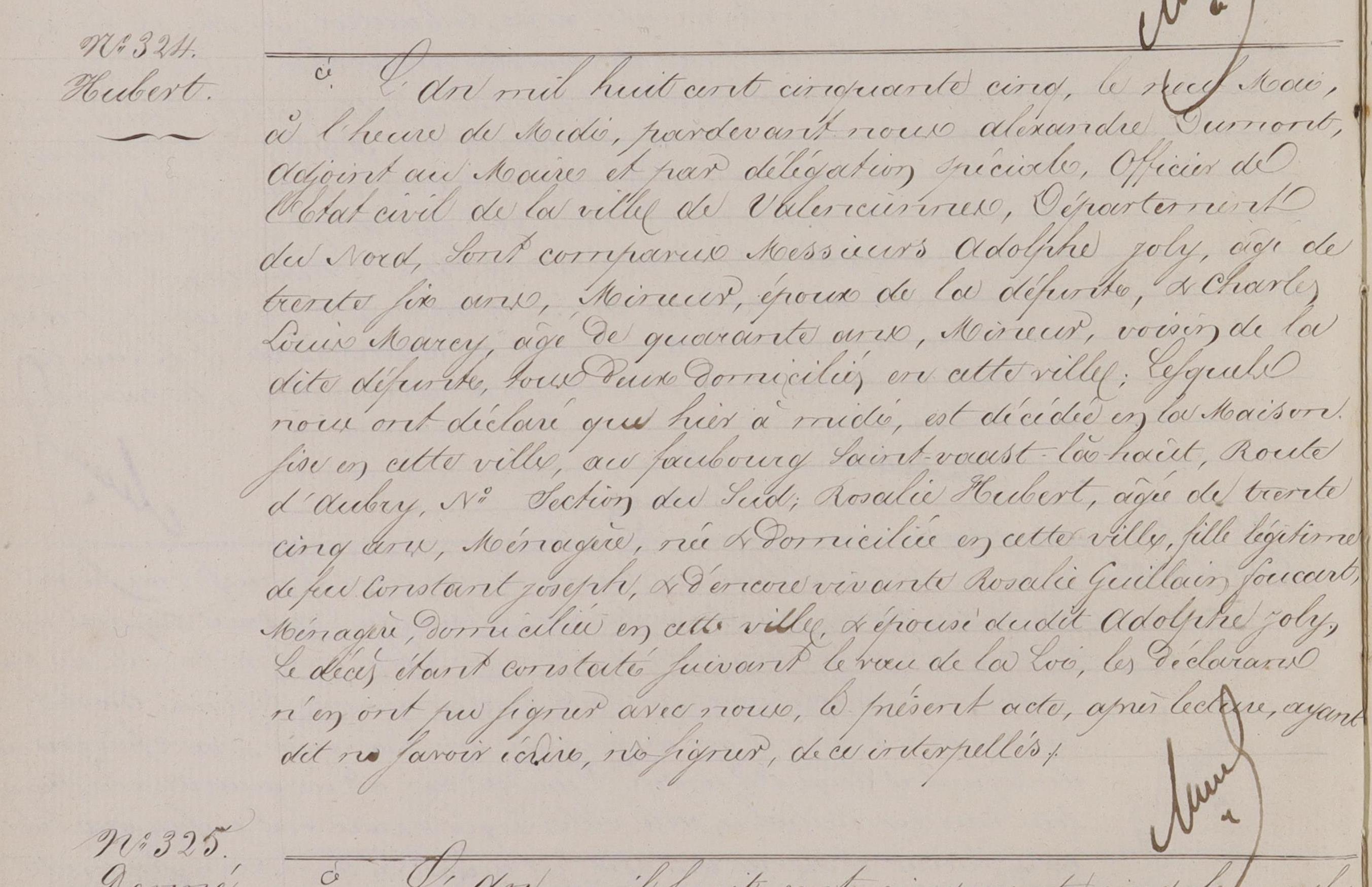 Je voulais vous signaler une erreur, concernant le registre cité en objet, en effet la vue 7/1087 se termine sur l'acte N° 322, la vue suivante la 8/1087 commence par l'acte 328, manifestement il manque une page. En fait je suis intéressé par l'acte N° 324 relatif au décès de Rosalie HUBERT en date du 9 ou 10 mai 1855. Comment me procurer cet acte ? Merci de vos réponses