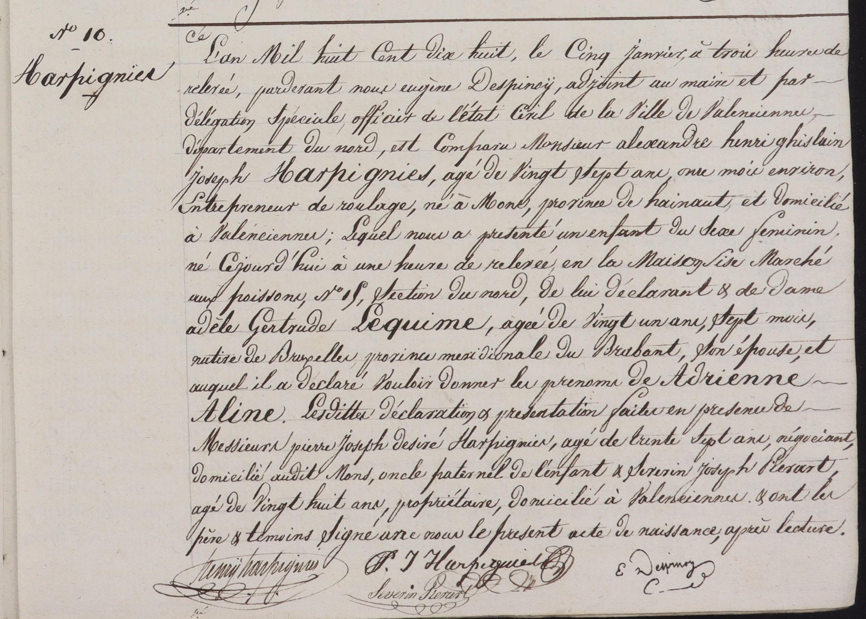Manque acte naissance HARPIGNIES Adrienne née le 05 01 1818 à Valenciennes