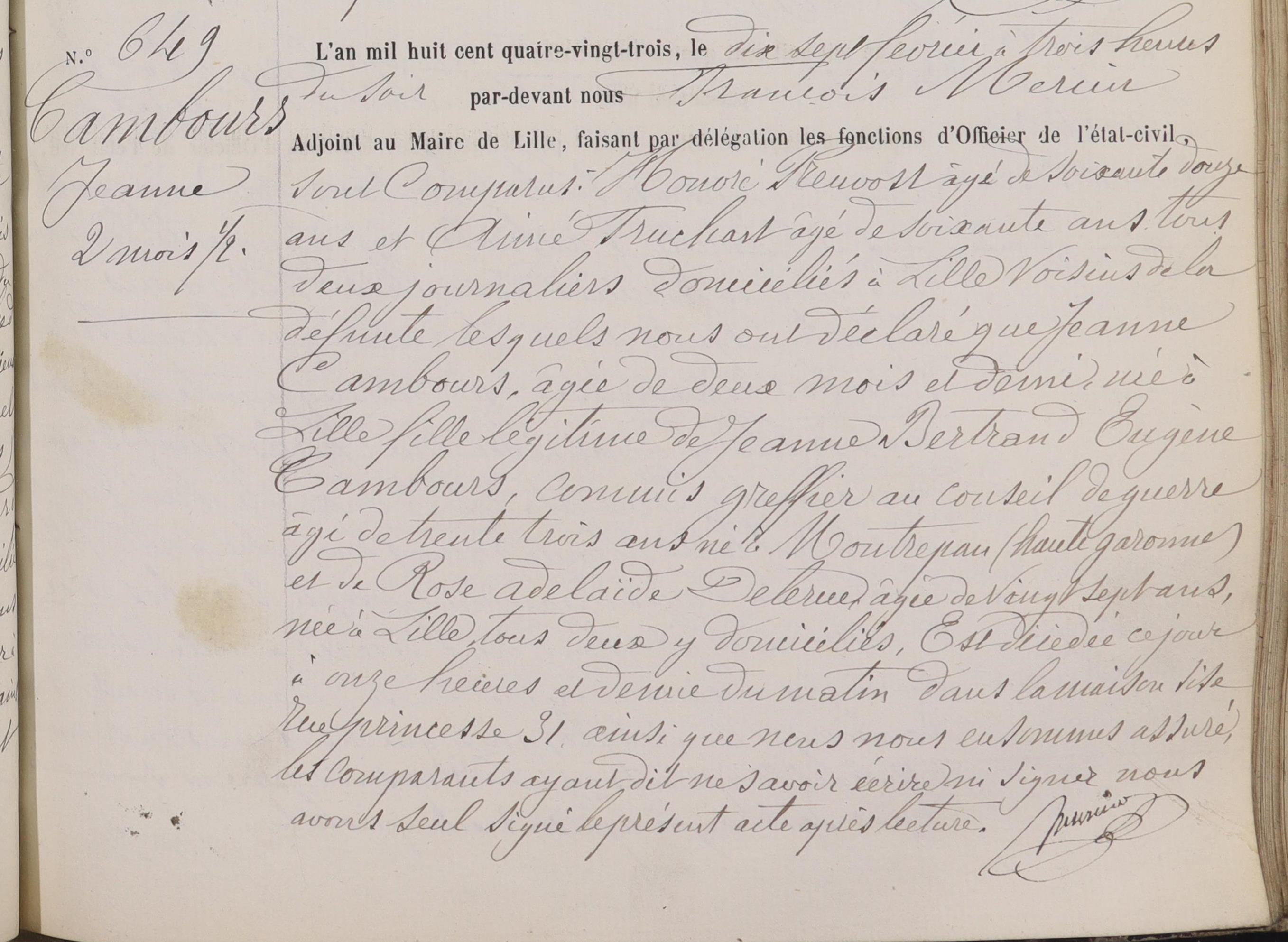 Une double page n'a pas été numérisée dans le registre des décès à l'Etat-Civil de Lille en 1883, sous la côte 1 Mi EC 350 R 085 LILLE / D (01/1883 - 04/1883). A la date du 17 février 1883, on passe de l'acte 645 <https://archivesdepartementales.lenord. ... d652898deb> à l'acte 650 <https://archivesdepartementales.lenord. ... 31b684c883>.
