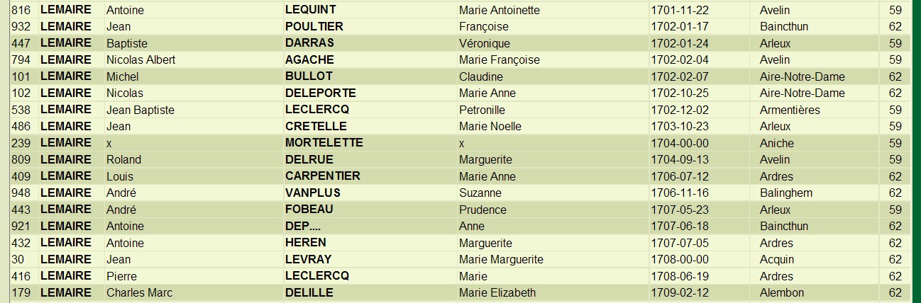 Voici un extrait de cette base faisant apparaitre les mariages au nom de Lemaire célébrés dans le département du Nord entre les années 1702 et 1707.