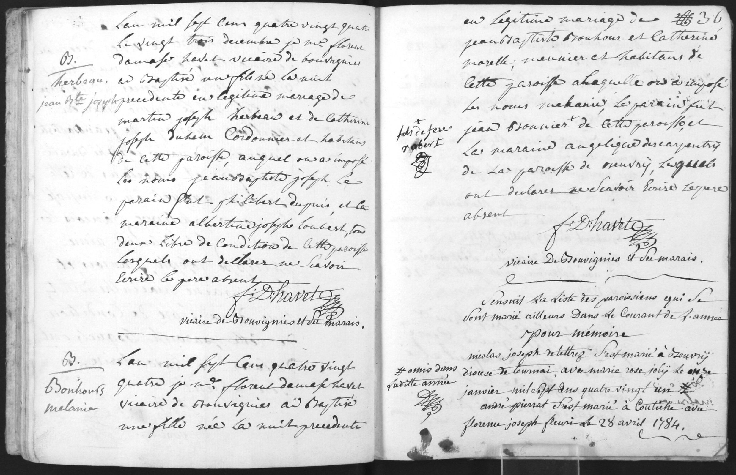 Dans le registre de Bouvignies pour l'année 1784 il manque le folio 36 de l'année . On passe du folio 35 en page 39/341 du microfilm au folio 37 en page 40/341 du registre.