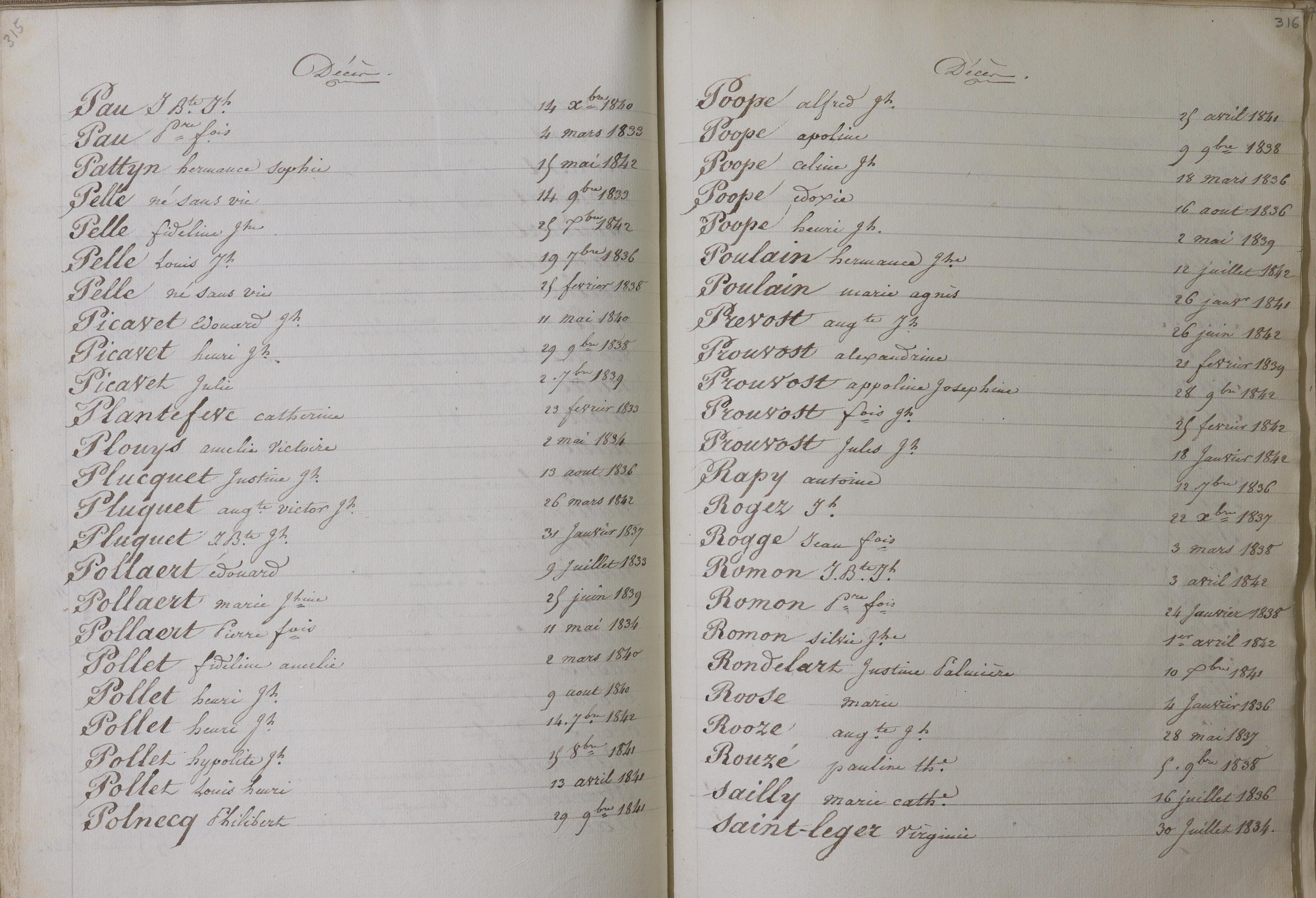 Entre la vue 81 et 82/87 il manque les pages (annotées au crayon en haut des vues) 315 et 316. Suite de la lettre "P" des décès ainsi que la lettre initiale "R". Je vous remercie