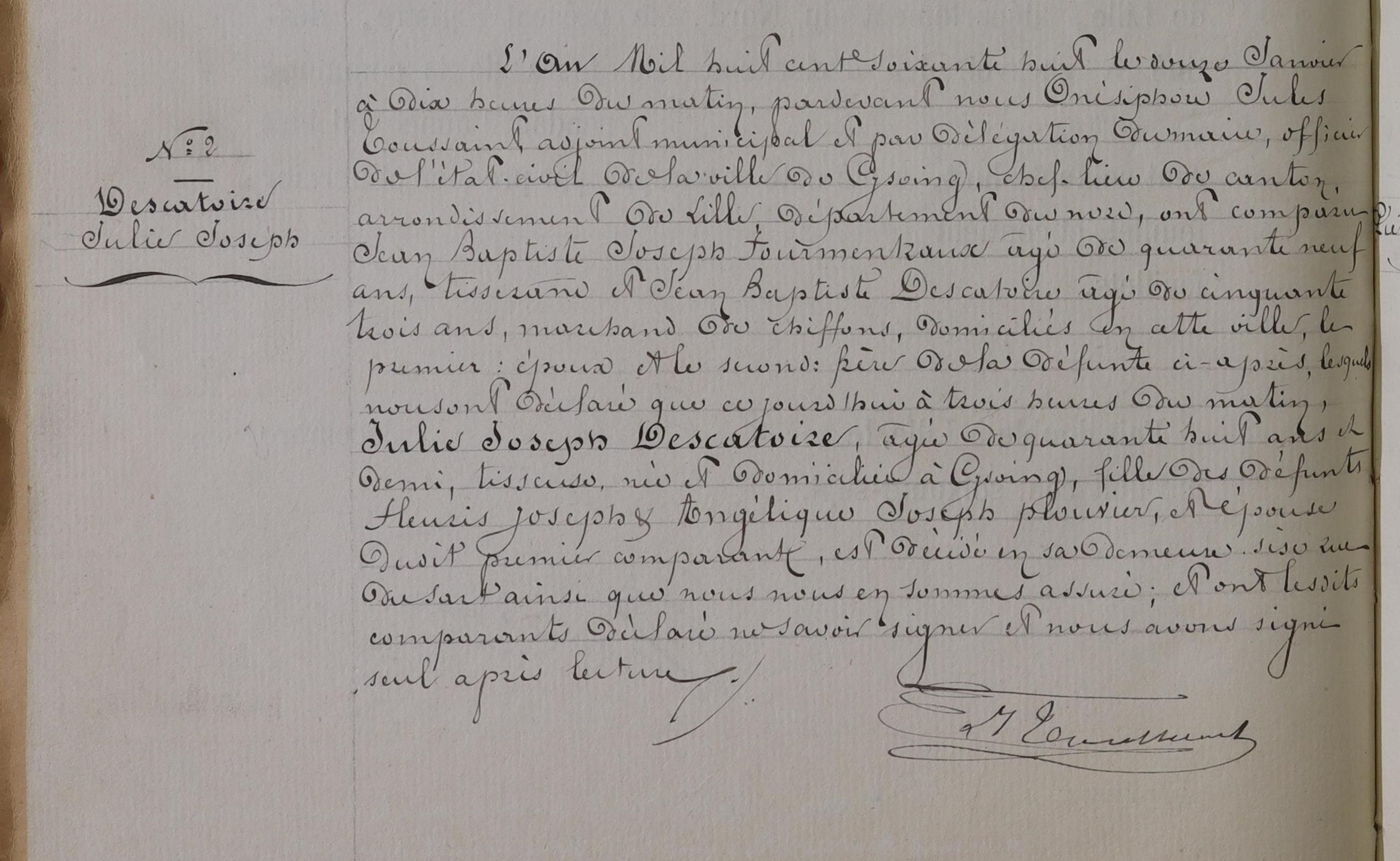 Je cherche un acte en date du 12/01/1868 à CySOING pour la personne de Julie DESCATOIRE.