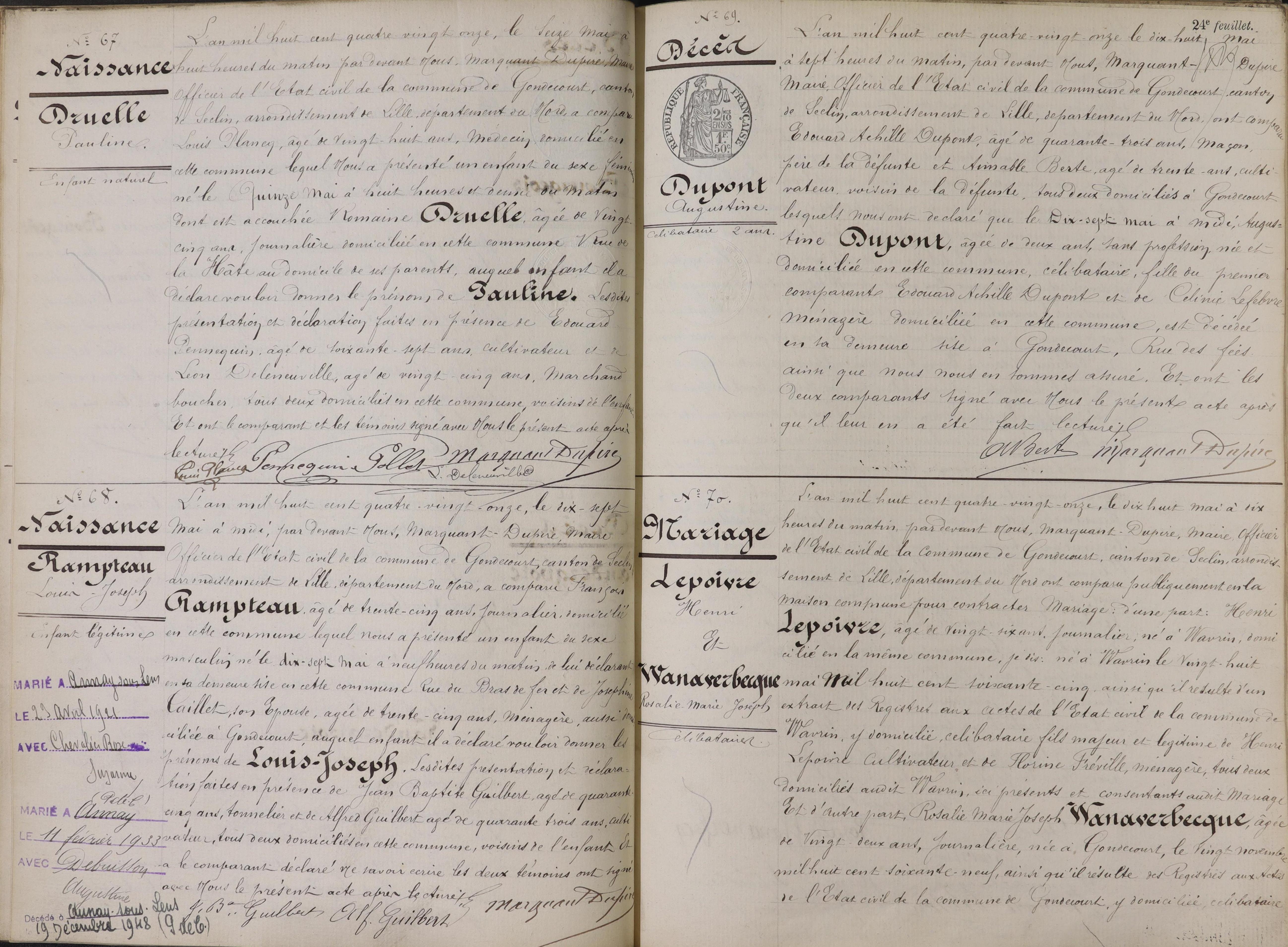 Il manque la page 130 qui montre les actes 67 à 70 de l'année 1891.