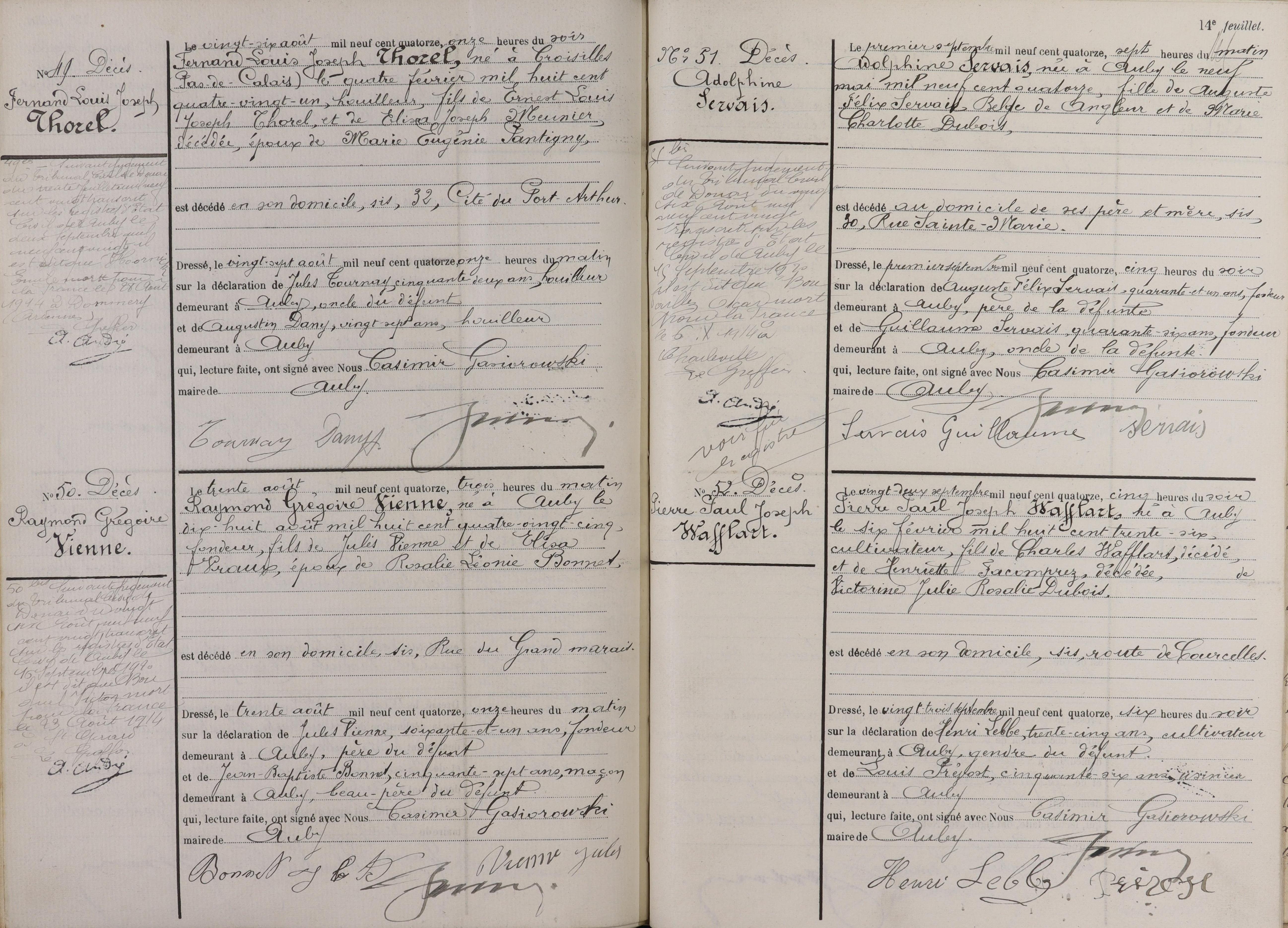 Dans les actes de décès AUBY / D [1903 - 1925], il manque les actes n°49 à 52 et les actes n° 41à 44 pour l'année 1914.