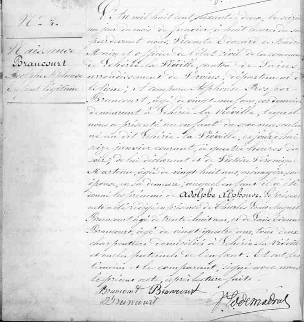Aucune info sur la date et le ieu du Décès à vous apporter mais Adolphe Alphonse BRANCOURT n'est pas né à Thiernu (02).