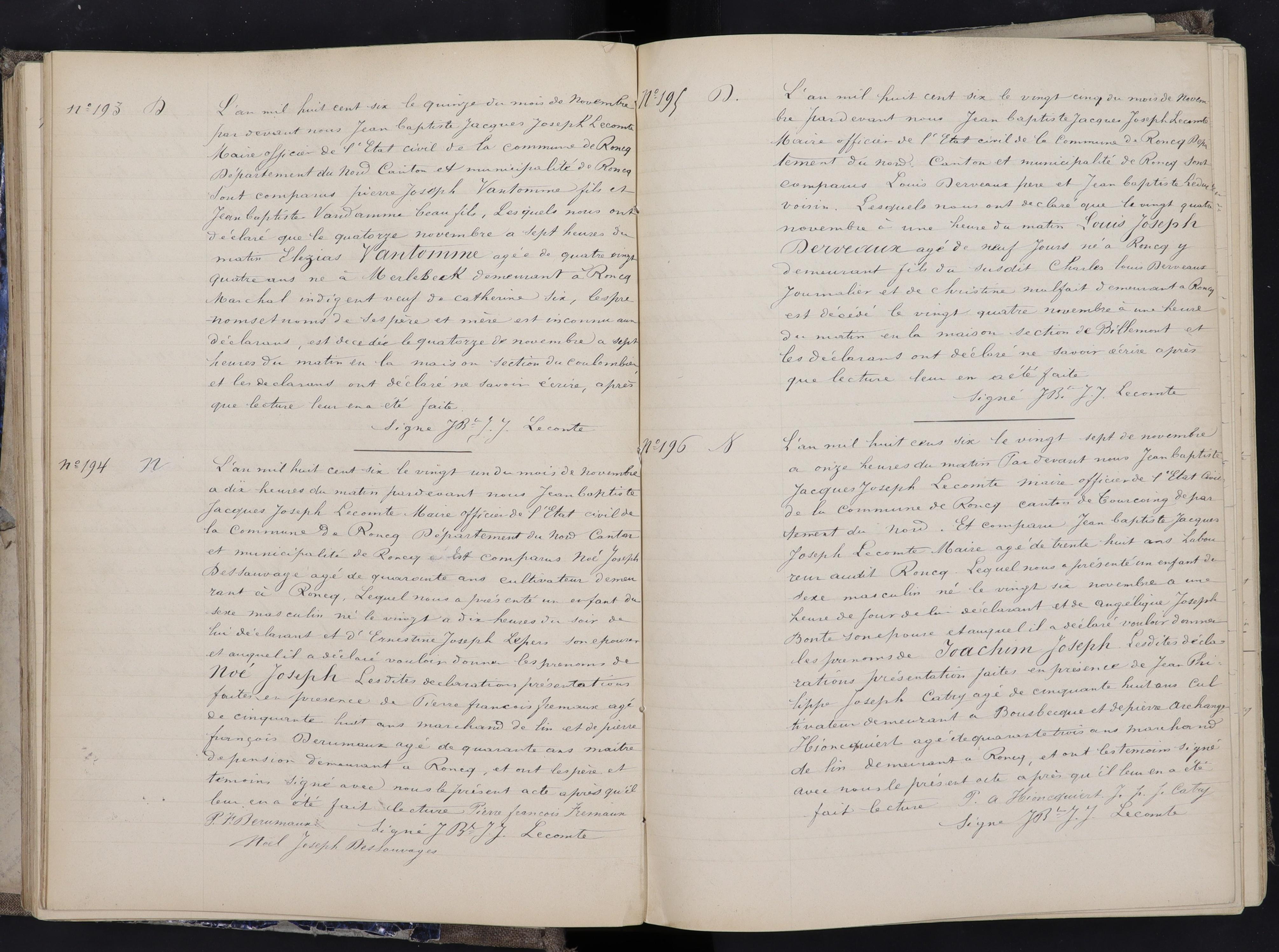 Dans le registre NMD 1793-1820, son nom apparaît bien dans l'index des naissances ; en revanche, sur la période de novembre une double page a dû être oubliée à la numérisation car on passe de l'acte n°193 (p.791) à l'acte n°198 (p.792).
