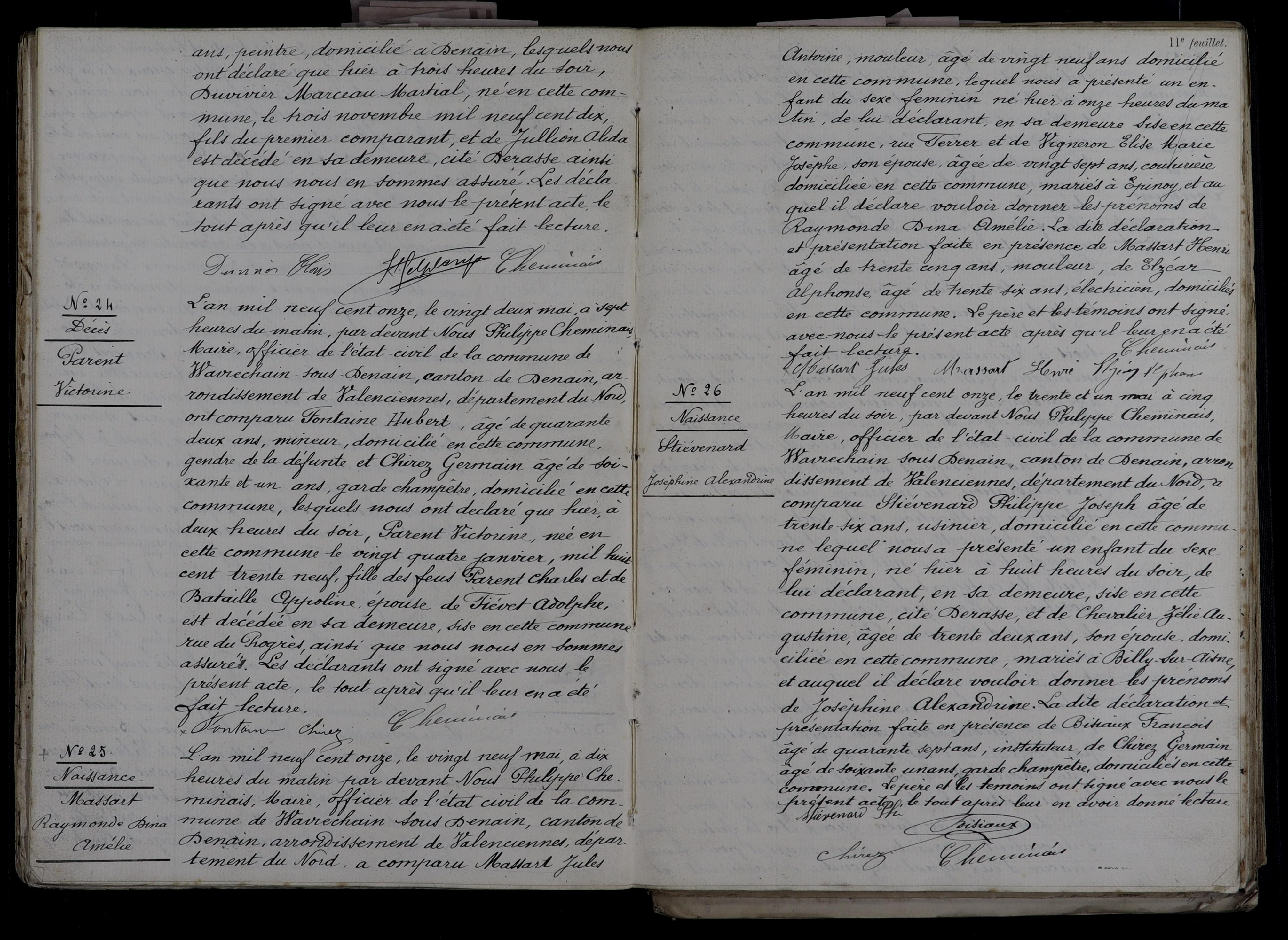 Dans le registre 3 E 5905 (Wavrechain-sous-Denain - NMD 1900-1920), il manque pour l'année 1911, le verso du 10ème feuillet et le recto du 11ème (voir les pages 222 et 233)