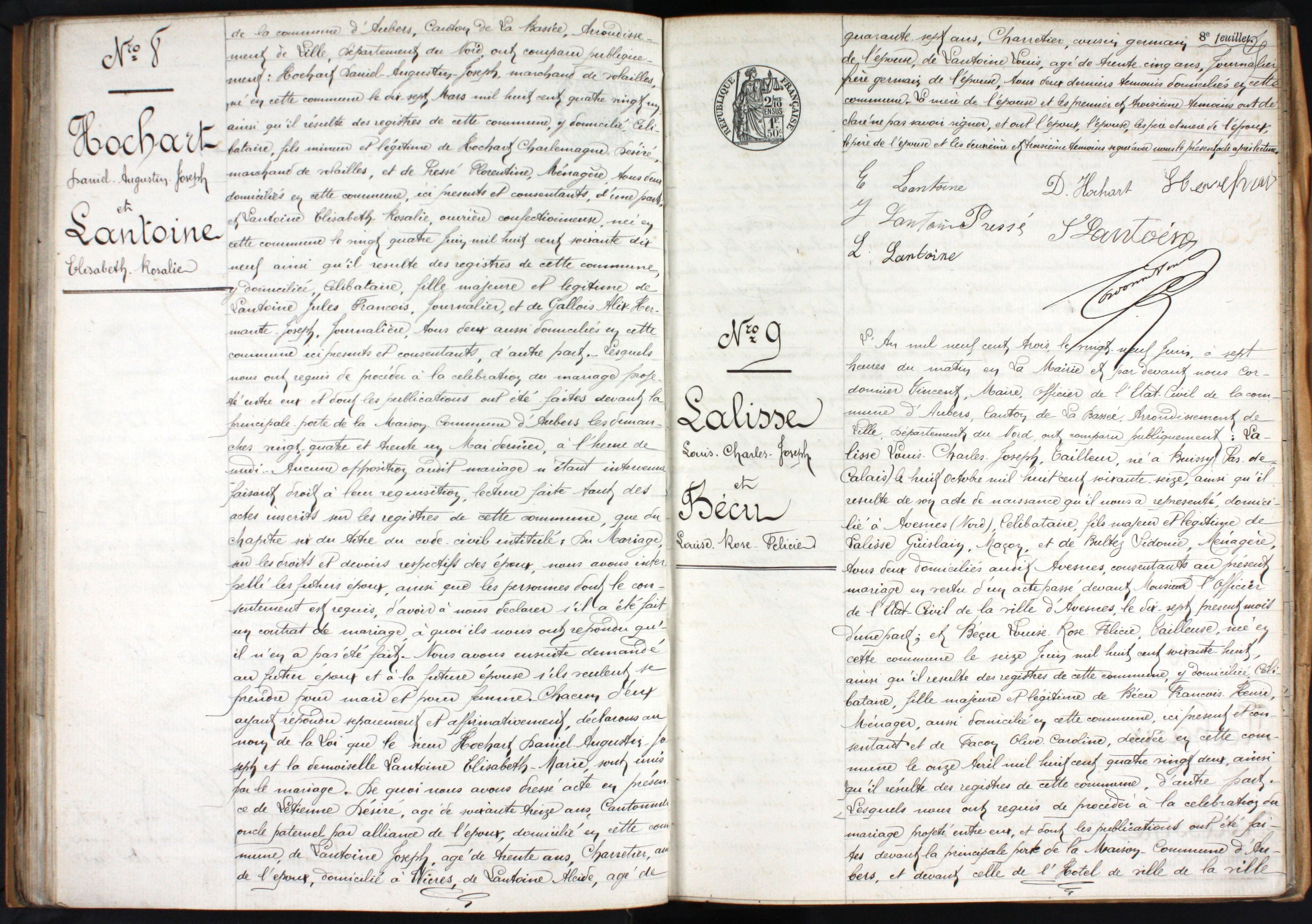Commune Aubers Actes Mariage année 1903 n°8 du 8 juin 1903 (partie) et n°9 (partie) du 29 juin (?) 1903 Mariage Lalisse -Becu manquants. Double page non scannée ? Oubli? Ou bien pages détruites?
