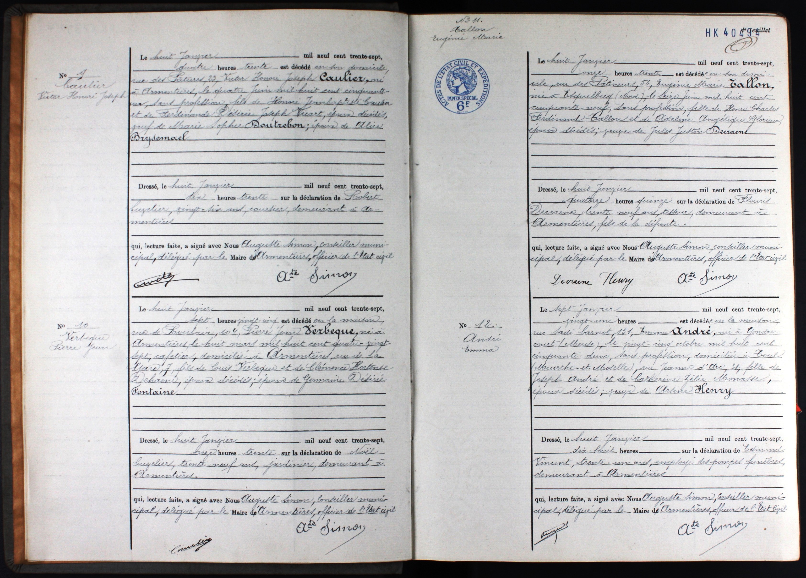 je faisais des recherches généalogiques sur la ville d'Armentières en 1937 et j'ai remarqué qu'au niveau des décès il manque la page avec les actes 10 (actes du 8 janvier 1937).