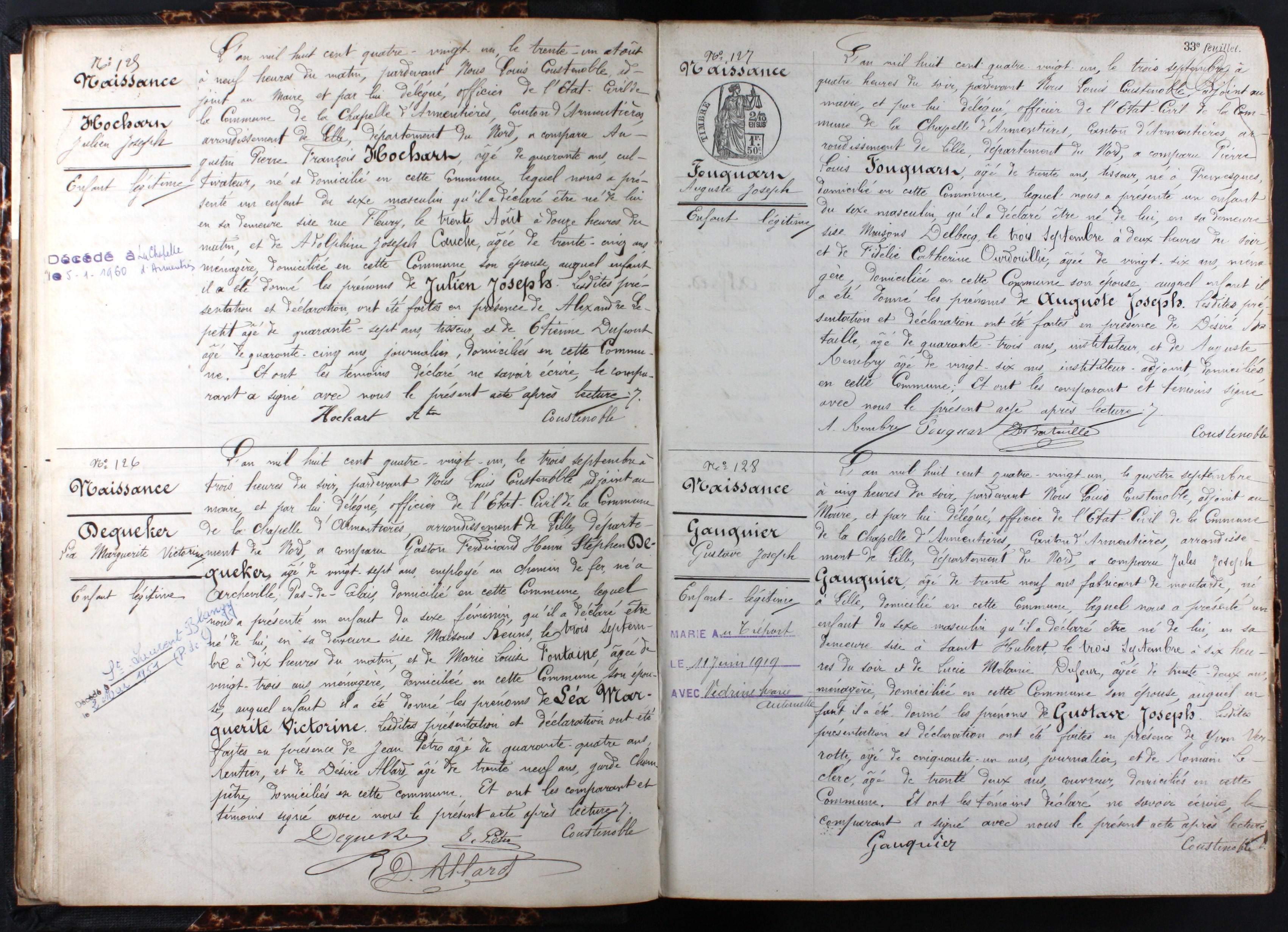 Il semble manquer une page sur La chapelle d'Armentières 1881-1890 (1Mi EC 143 R 002) pour l'année 1881, on passe page 41-42 de l'acte de naissance 124 à l'acte 129, alors que l'acte 128 est bien référencé dans la table jointe p 58 (Gauquier Gustave Joseph)