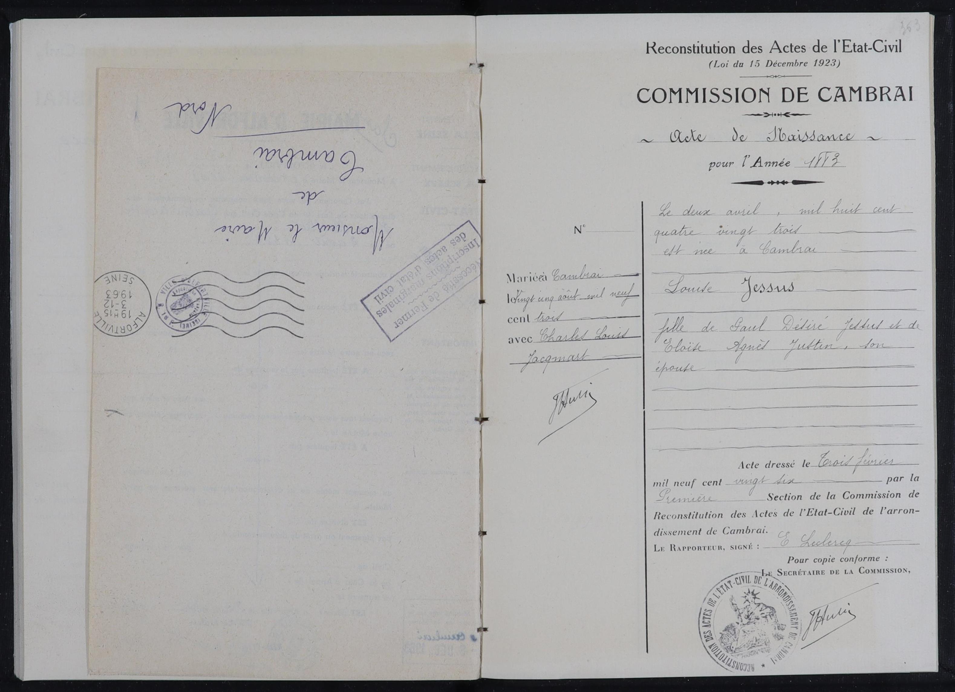 Naissance du 02/04/1883 à CAMBRAI (reconstitution) : le feuillet est caché par celui de la mairie d'Alfortville indiquant son décès. On ne peut voir son ascendance.